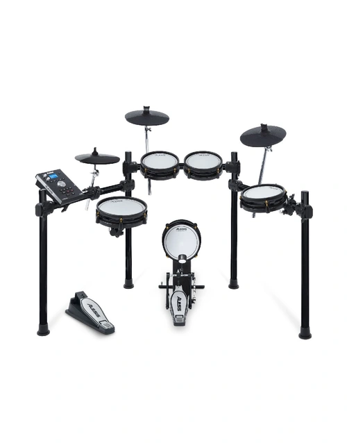 The Alesis Command Mesh SE Special Edition All Mesh Electronic Drum Kit features all mesh-head pads that deliver an authentic drumming experience. This kit includes an 8" mesh kick with pedal, a 10" dual-zone mesh snare drum, and three 8" dual-zone mesh toms. The set also features a a 10" hi-hat with foot pedal, 10" ride cymbal and 10" crash with choke. The included Command Drum Module features 74 drum kits (54 preset, 20 user) with 671 sounds. You can build a custom kit from your own sounds by loading them via a USB thumb drive. Plus, with 60 play-along tracks and a built-in performance recorder, you'll have an endless source of fun and creativity. All of this mounts to a premium 4-post rack with non-slip clamps, providing a durable foundation that is easy to set up and move.