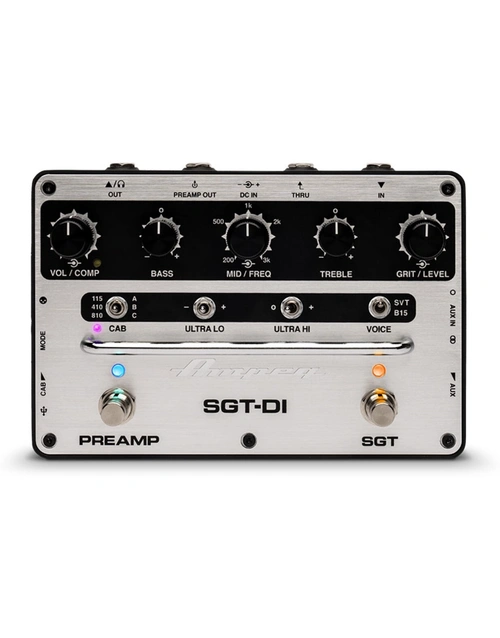 The Ampeg SGT-DI is a powerful and versatile bass preamp and DI pedal that gives you everything you need to perfect your tone With its enhanced Super Grit Technology overdrive circuit, versatile 3-band EQ, Ultra-Hi and 3-way Ultra-Lo switches, variable compressor, and Aux/Headphone section, the SGT-DI can cover any sonic territory you can imagine.