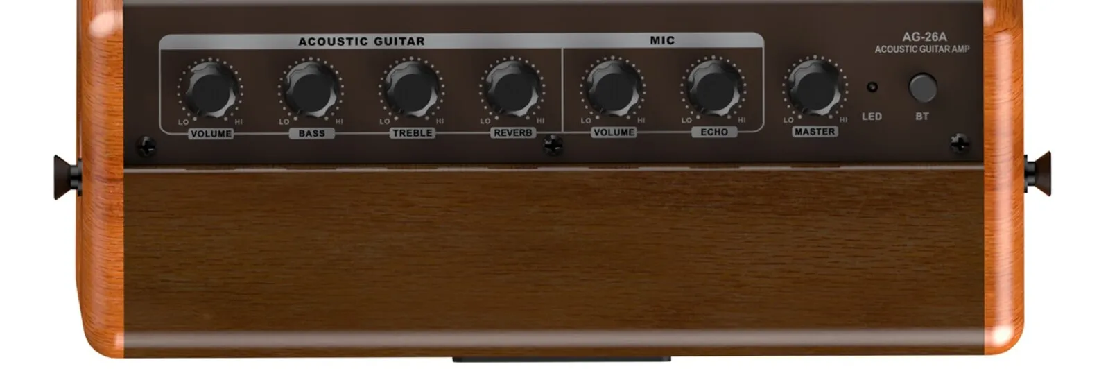 The Aroma AG-26A 25W Acoustic Guitar Rechargeable Amplifier features 26W of power, independent guitar and mic channels, and Bluetooth 4.2 functionality. This rechargeable acoustic guitar amp features a Li-ion battery, and carry handle, and is mountable on a speaker pole for extra projection.
