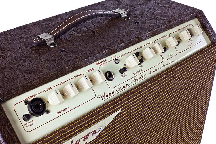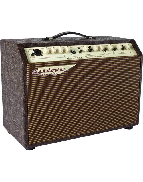 The Ashdown Woodsman Jumbo is a 65 watt acoustic combo built for singers, guitarists and duo performers who need clean headroom and practical control. Its dual 8 inch speakers deliver a wide, natural response that suits both vocals and acoustic instruments, while separate inputs for microphone and guitar make it easy to run a full performance through one compact amp. The mic channel includes a full 3-band EQ, letting you shape your vocal sound precisely, and both channels benefit from phase reverse and notch filter options to help control feedback on stage. Enhanced reverb algorithms, including Hall and Spring, add depth without clouding clarity. An effects loop allows transparent integration of external pedals, and an Aux input supports backing tracks or reference audio. The rugged wooden cabinet gives the amp a warm, classic look while keeping it durable for regular gigging.