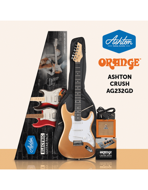 The Ashton AG232GD Electric Guitar Amp Pack, finished in Gold, comes complete with an AG232 Electric Guitar, gig bag, strap, lead, an Orange Crush MINI Amplifier, and free online guitar lessons. With 5 different selectable pickup positions, the Ashton AG232GD is a truly versatile guitar. Its smartwood fretboard feels and looks great, and will help you start shredding in no time.