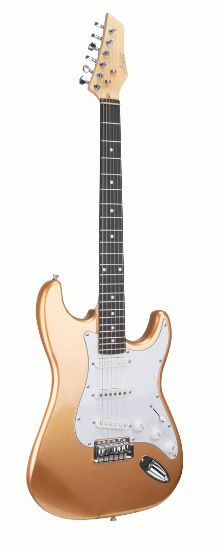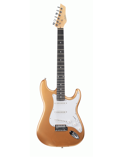 The Ashton AG232GD in Gold is a traditionally styled S-type electric guitar that delivers classic looks and versatile tones. Built with a poplar body and Smartwood fingerboard, it’s comfortable to play and offers a smooth response for chords and leads alike. Its triple single-coil pickup setup and five-way selector switch give you a wide tonal range, from crisp cleans to punchy rhythms. Included with the guitar are a gig bag, strap, and lead—everything you need to get started right away.