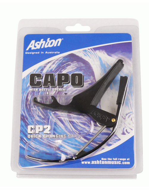 The Ashton CP2 Trigger Style Guitar Capo, is a quick release design that enables quick key changes between songs. It features a durable trigger action, can be used on most steel-string curved fretboard guitars and even has a built in bottle opener.