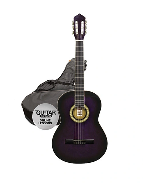 The SPCG Series is a great introductory Starter Pack. The pack includes a Gig Bag, with Online Lesson Packs. Available in six fun colour finishes including Amber (AM), Black (BK), Pink (PK), Transparent Purple (TP), Transparent Red Burst (TRB) and Transparent Blue Burst (TBB) - this Classical is a 3/4 sized slim-line bodied guitar great for those interested in lighter strings to practice classical style playing and finger picking styles on.
