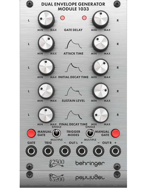 Classic 1033 analog dual DADSR module from the '70s. Authentic reproduction of the circuitry from the "2500" Series. The module contains two identical envelope generators for creating control signals. Each generator features 5 adjustable parameters: Gate Delay, Attack Time, Initial Decay Time, Sustain Level, Final Decay Time.