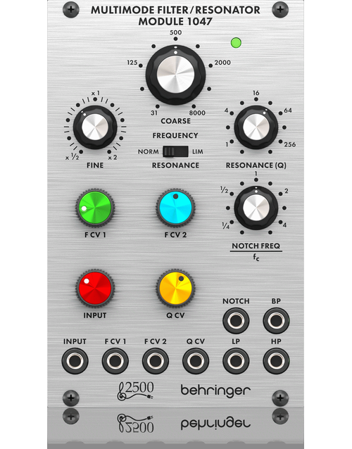 Classic-sounding 1047 analog multi-mode filter and resonator module from the '70s. Authentic reproduction of the circuitry from the "2500" Series. Consists of a highly resonant 12 dB state-variable filter capable of proving a wide variety of formant shaping and tonal modulation. Filter simultaneously provides high-pass, band-pass, low-pass and notch outputs.