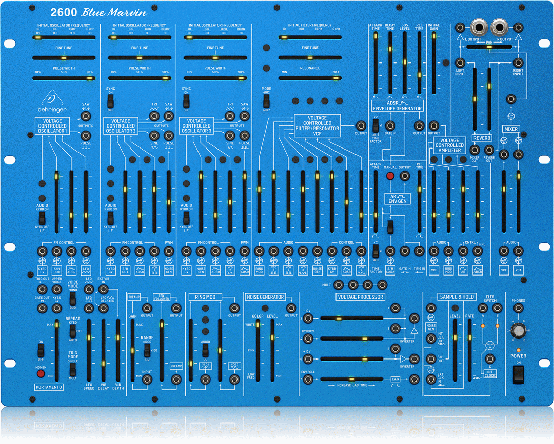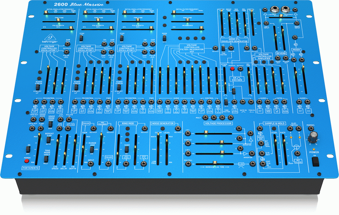 Behringer 2600 BLUE MARVIN, a limited edition, ultra-affordable and even more feature-packed homage to the iconic ARP 2600 synthesizer. Compared to the original Behringer 2600, the BLUE MARVIN features a mechanical spring reverb, hand-picked components, uni-color LEDs on each fader plus a super slick paint job that’ll make your setup pop! Conjure up virtually any sound imaginable with incredible finesse and ease. The pure analog signal path is based on the authentic ARP 2600 circuitry from the 70s with matched transistors and JFETs. Owning a BLUE MARVIN is like having your piece of history enabling you to re-create timeless classics or forge your own musical path.