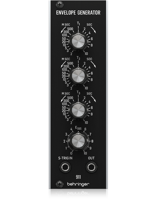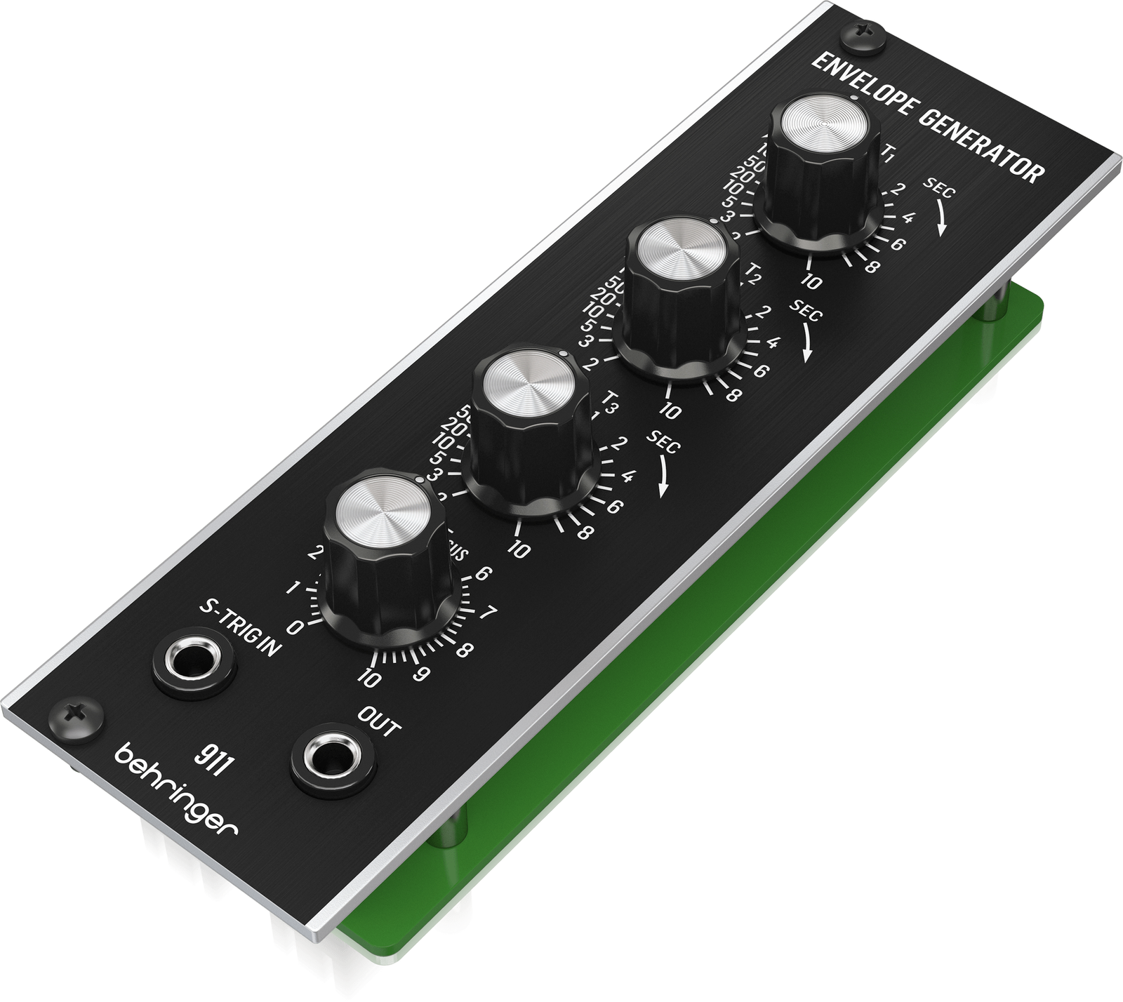 The Behringer 911 Envelope Generator, part of their series of vintage Moog-inspired Eurorack modules, is a four-stage envelope generator, perfect for controlling VCAs and filters. The four-stage envelope features controls for attack, decay, and release time, plus sustain level, creating your standard ADSR envelope. The range of times per stage is wide and goes from 2ms all the way up to 10 seconds. This allows for everything from super snappy envelopes to longer envelopes that develop and shape parameters over time.