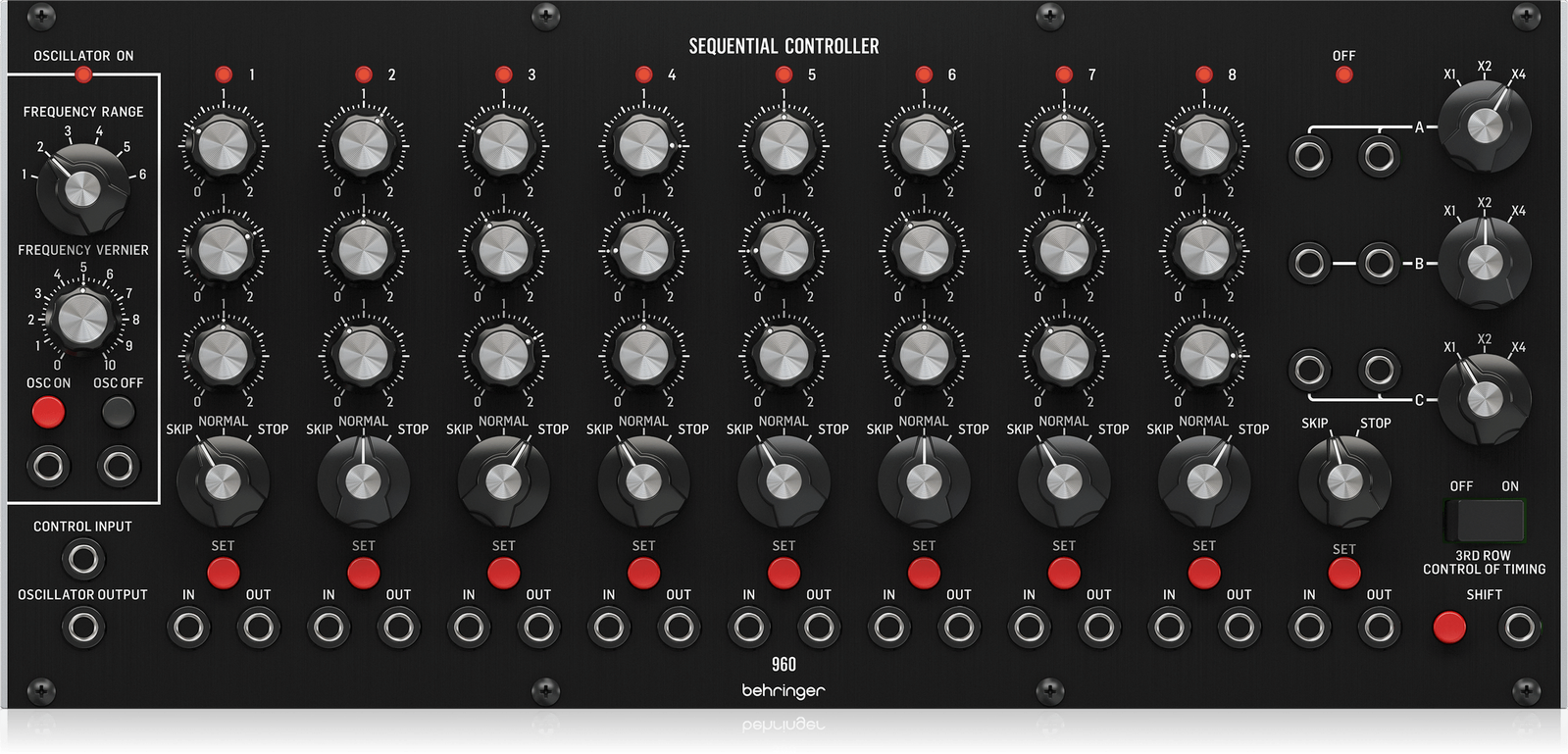 Enter the Behringer 960 SEQUENCER CONTROLLER. An authentic reproduction of the circuitry from the “Modular 55” series used by the world’s most famous pop, rock and jazz musicians. Now you can build your very own, unique synthesizer that can fit in a standard Eurorack case for a very affordable price. Mix and match with specific modules to customize your synth and complement the genre of music you play or go all out and have a room filled from floor to ceiling with modules that’ll fulfill any synth geek’s wildest dreams.