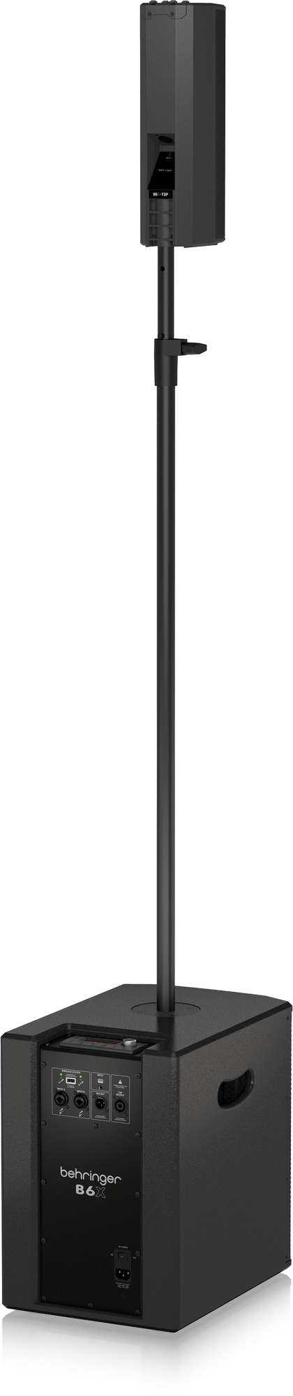 The Behringer B6X is built to deliver professional-grade sound in a compact, portable system. Its custom 10" long-excursion woofer produces deep, tight bass, while four 3" neodymium drivers add smooth midrange and crisp highs. Driven by an 800-watt Class-D amplifier, the B6X achieves powerful output with minimal weight. Its intelligent DSP presets optimise performance across any environment, making it ideal for live performers, DJs, event hosts, and installations. A built-in 6-channel digital mixer offers independent volume and EQ per channel, controllable via onboard LCD or mobile app. Studio-grade TC Electronic effects and Klark Teknik DSP deliver polished, refined tone, while Bluetooth streaming, True Wireless Stereo pairing, and XLR linking expand your setup options, allowing you to link two B6Xs together, as well as supporting wireless Behringer microphone systems (not included). With rugged construction, ergonomic transport design, and a supplied pole and cable, the B6X combines portability, precision, and power.
