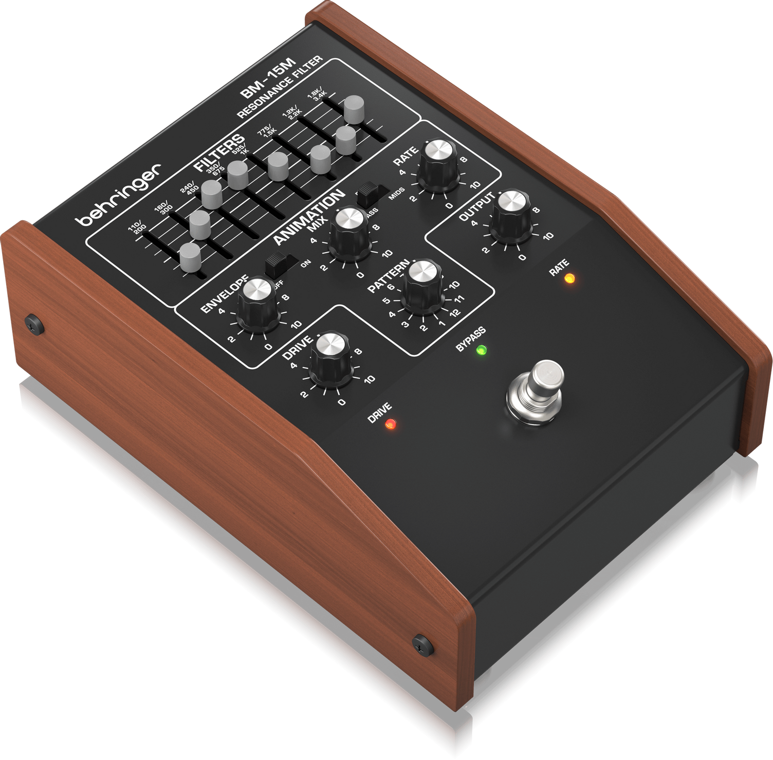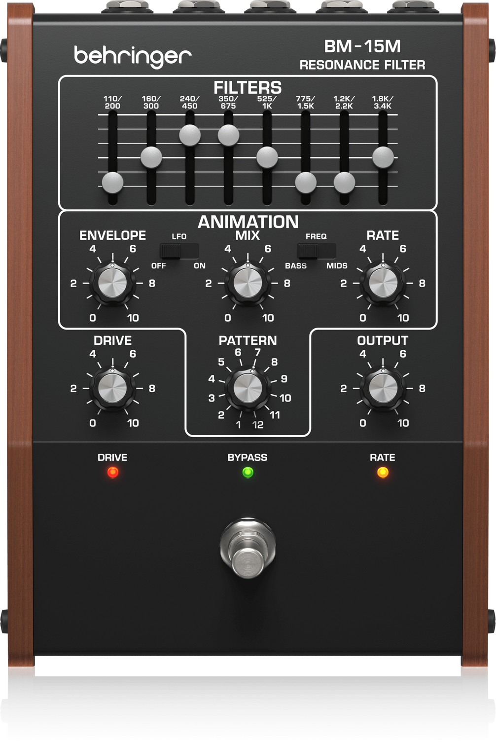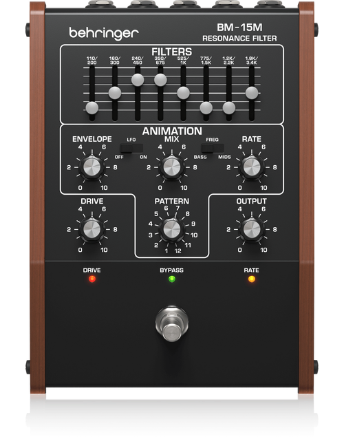 The Behringer BM-15M Resonance Filter is an analogue modulation pedal built around eight filter bands and 12 selectable rhythmic patterns. Rather than sweeping a single filter manually, the BM-15M sequences filters in time, creating animated movement that can pulse, step or evolve across your signal. Fast patterns generate percussive, groove-driven textures, while slower sequences produce sweeping, evolving motion ideal for pads and sustained chords.