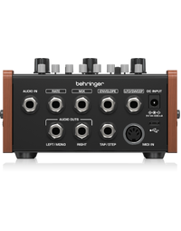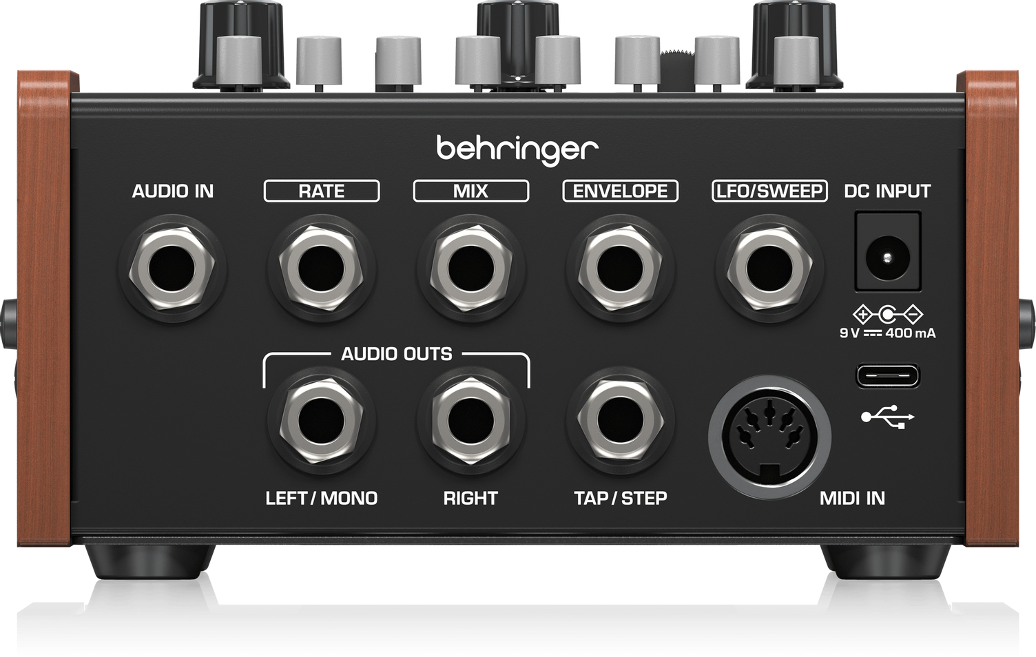 MIDI via dual 5-pin DIN and USB-C allows tempo sync to DAW or drum machine, and CV inputs (0–5 V) provide control over Rate, Mix, Envelope and LFO sweep. Stereo outputs expand spatial possibilities, and an expression input supports real-time manipulation.