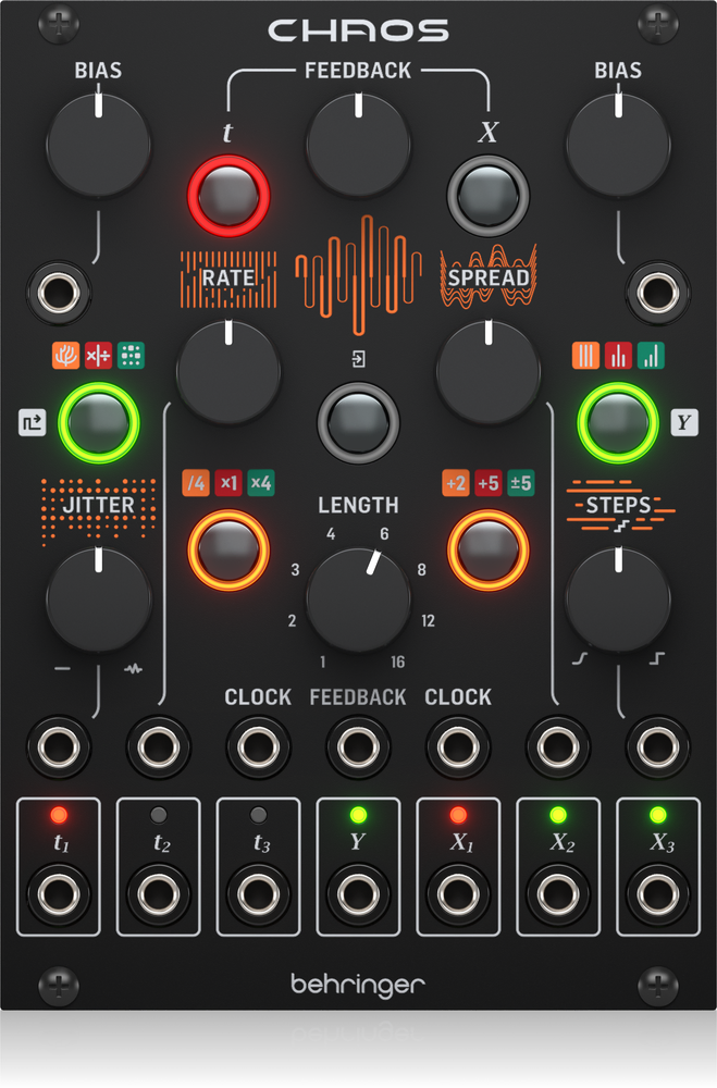 Comprising the T section and the X section, each part of the CHAOS contributes to its mesmerizing capabilities. The T section generates random gates synchronized to a master clock, while the X section produces three random voltages. Patch and tweak these sections endlessly to craft truly unique sequences and compositions.