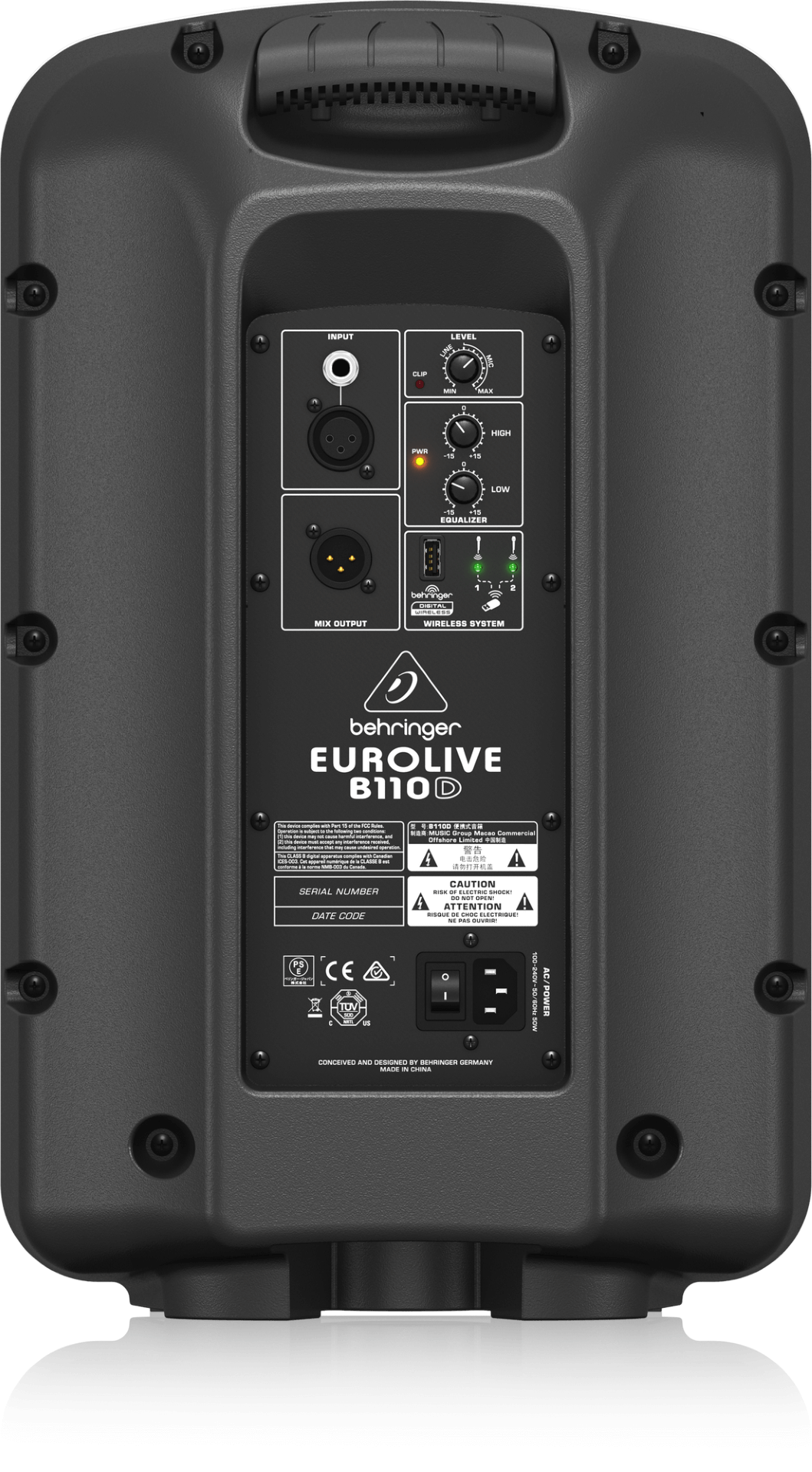The Behringer Eurolive B110D is a compact, lightweight, portable active PA speaker, with 300 Watts of power, a 10" long-excursion low-frequency driver for thumping bass, and a 1.35" aluminium diaphragm driver mounted on an exponential horn for clear high-frequency response. The B110D is wireless-ready, with the built-in ability to connect to Behringer's Ultralink ULM series of wireless microphone systems (sold separately), which provide high quality sound thanks to their digital 2.4GHz frequency spectrum. The Behringer 110D also features one 1/4"/XLR line input, an XLR mix output, a 2-Band EQ, and a level control.