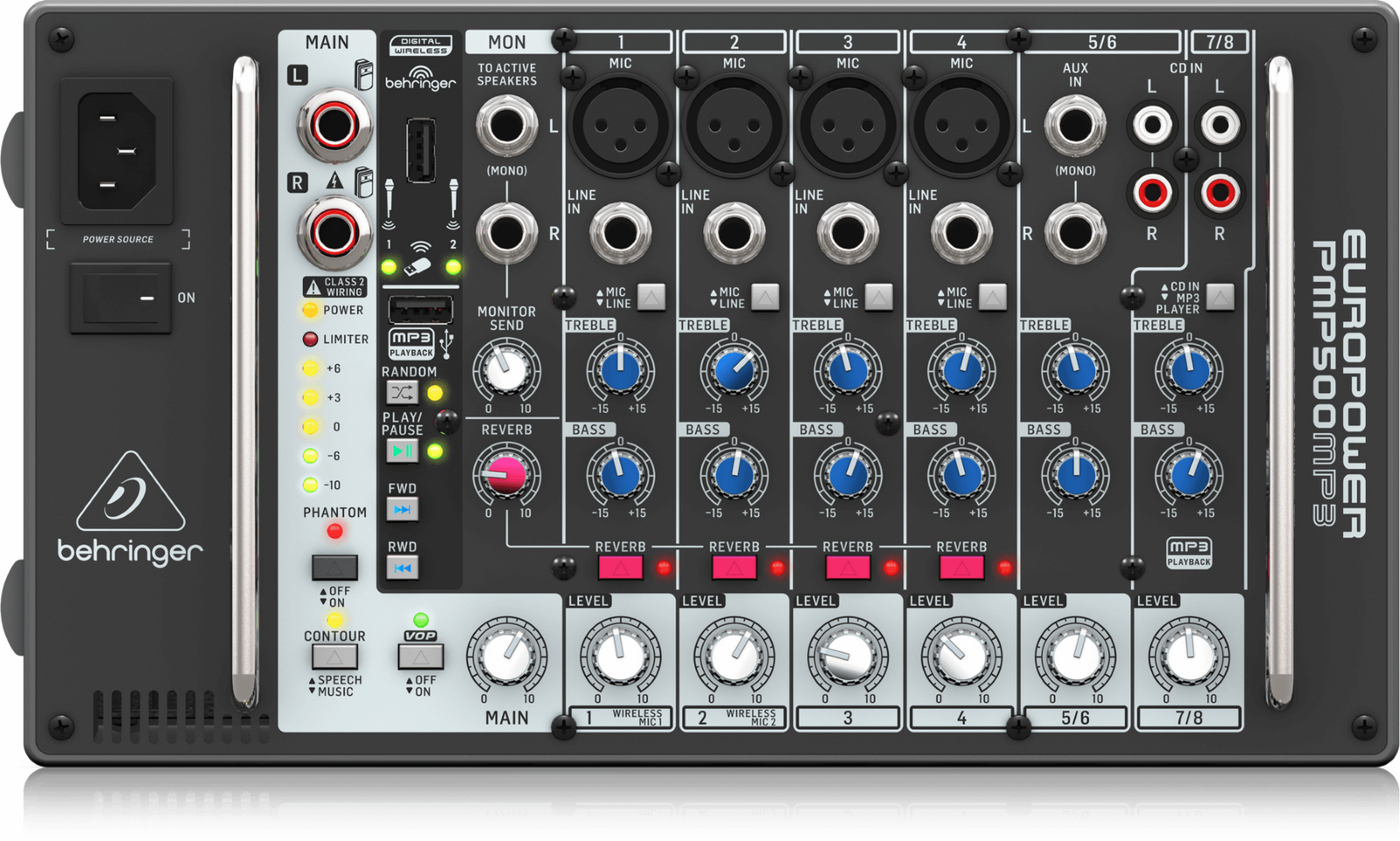 Looking for the ultimate, all-in-one portable PA mixer? The EUROPORT PMP500MP3 delivers articulate, high fidelity performance – yet weighs only 3 kg / 6.6 lbs. Thanks to its 8-channel, 500-Watt powered mixer with onboard mp3 player, Reverb and wireless microphone connectivity, the PMP500MP3 can easily fill a large-sized room with crystal-clear, vibrant sound – making you the star of your event!