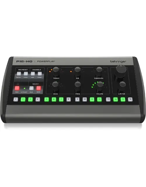 The Behringer P16-HQ POWERPLAY 16 is a premium 16-channel in-ear personal monitoring mixer designed for superior on-stage and studio monitoring. Featuring a 114 dB dynamic range D/A converter and an advanced amplifier stage, it delivers noise-free audio with enhanced volume for low-impedance headphones and in-ears. Intuitive controls include 16 backlit channel buttons, level and panorama controls, 3-band EQ per channel, and adjustable mid-band frequency. Solo, mute, and output limiter functions ensure precise control and hearing protection. Ultranet CAT5e connectivity provides power and 16 signal channels, simplifying setups, while compatibility with P16-M mixers and MIDI input for remote control expand its versatility. With ultra-low latency (<1 ms) and secure mic stand mounting options, the P16-HQ ensures professional-grade performance in any setup.