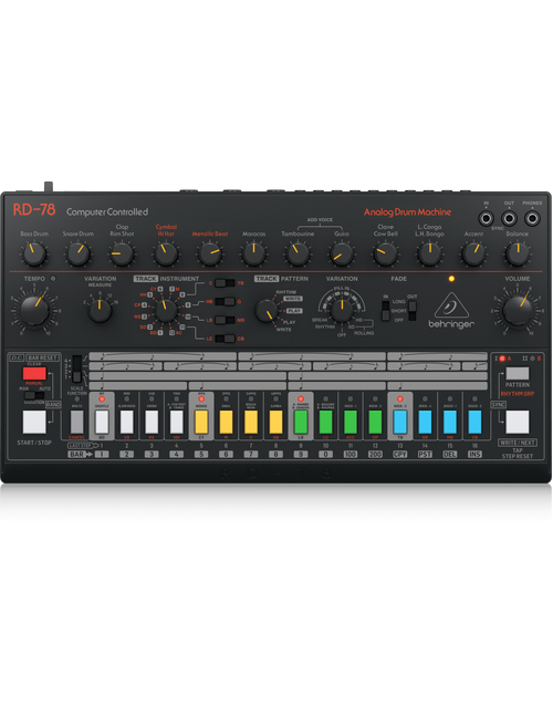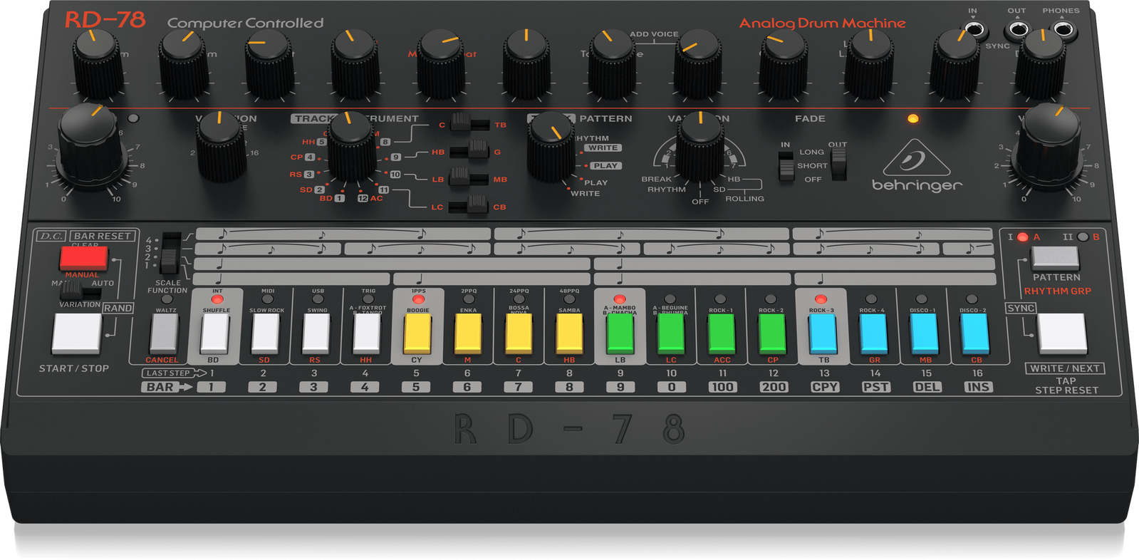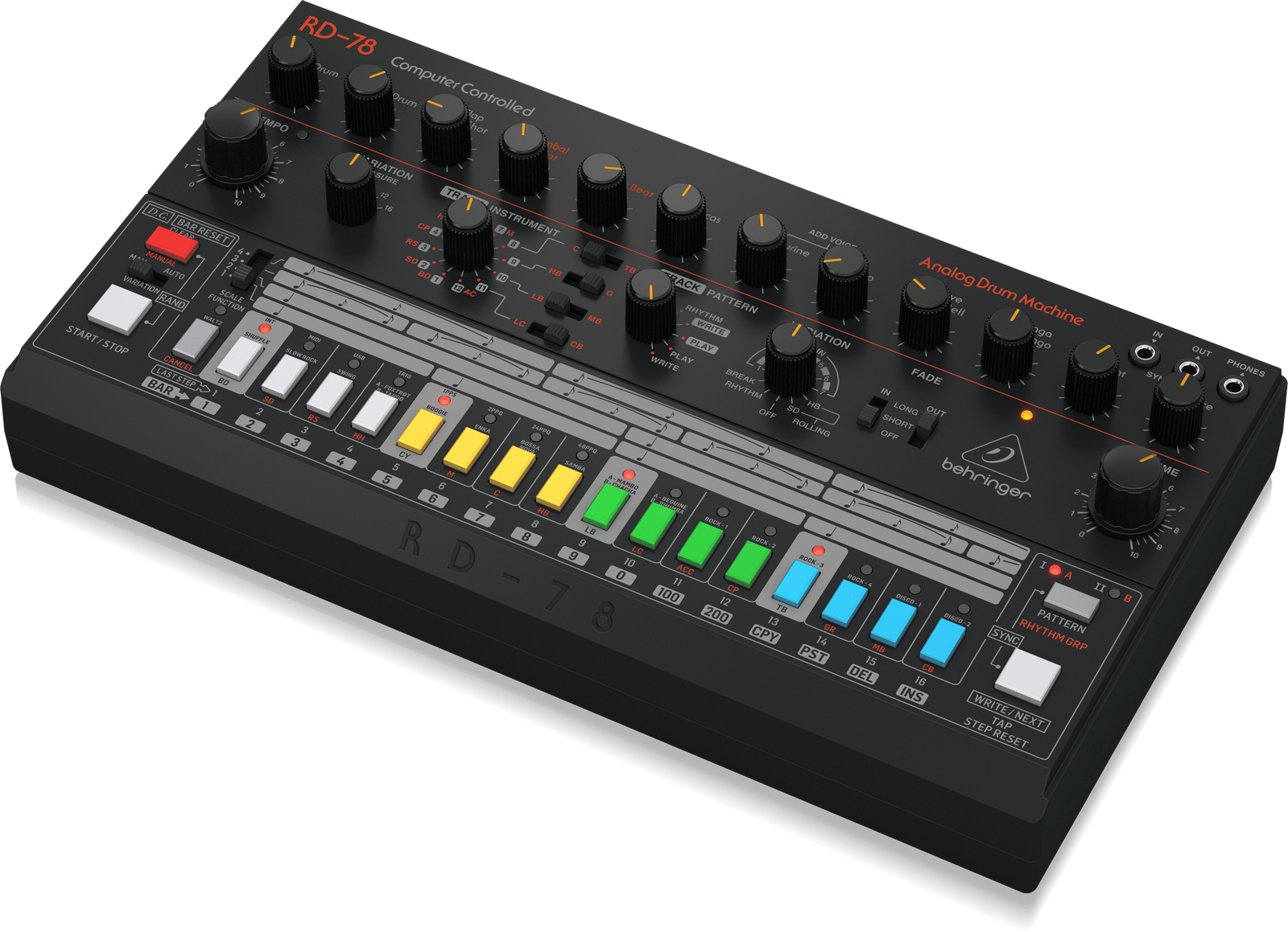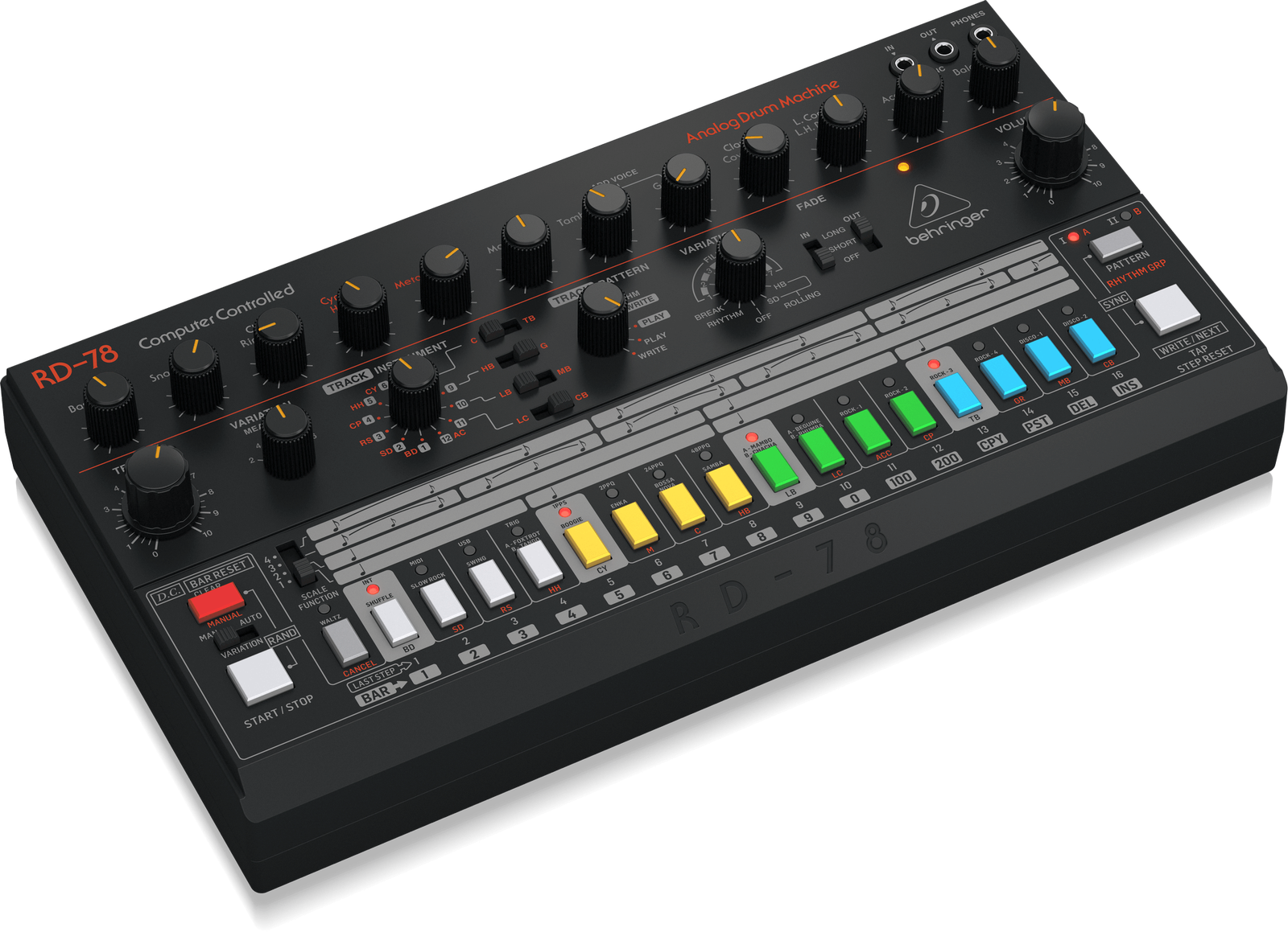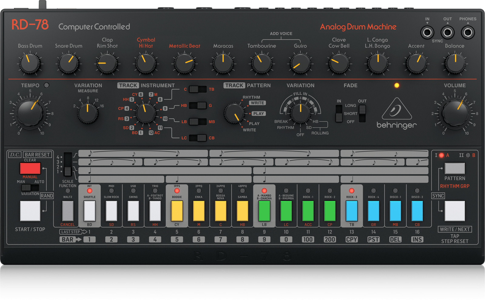 The Behringer RD-78 is a true analogue drum machine inspired by the legendary CR-78, faithfully recreating its circuitry while adding modern performance features. It delivers 15 authentic drum sounds and 34 classic rhythm presets, with fills, rolls, and breaks for dynamic variation. A 16-step sequencer with real-time switching makes programming intuitive, while the ability to chain up to 250 bars lets you build complete songs. With 10 independent outputs, you can process each drum separately in the studio or on stage. MIDI, USB, clock, and DIN sync options ensure seamless integration with both vintage and modern setups. Packed with hands-on controls and authentic-style step buttons, the RD-78 bridges past and present. At Riffs & Licks Music, we think this is a powerful way to bring iconic 70s and 80s drum machine character into today’s productions.