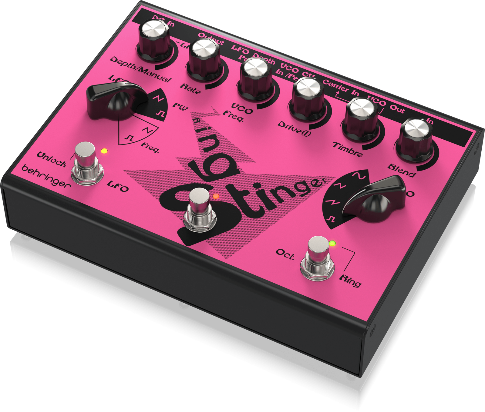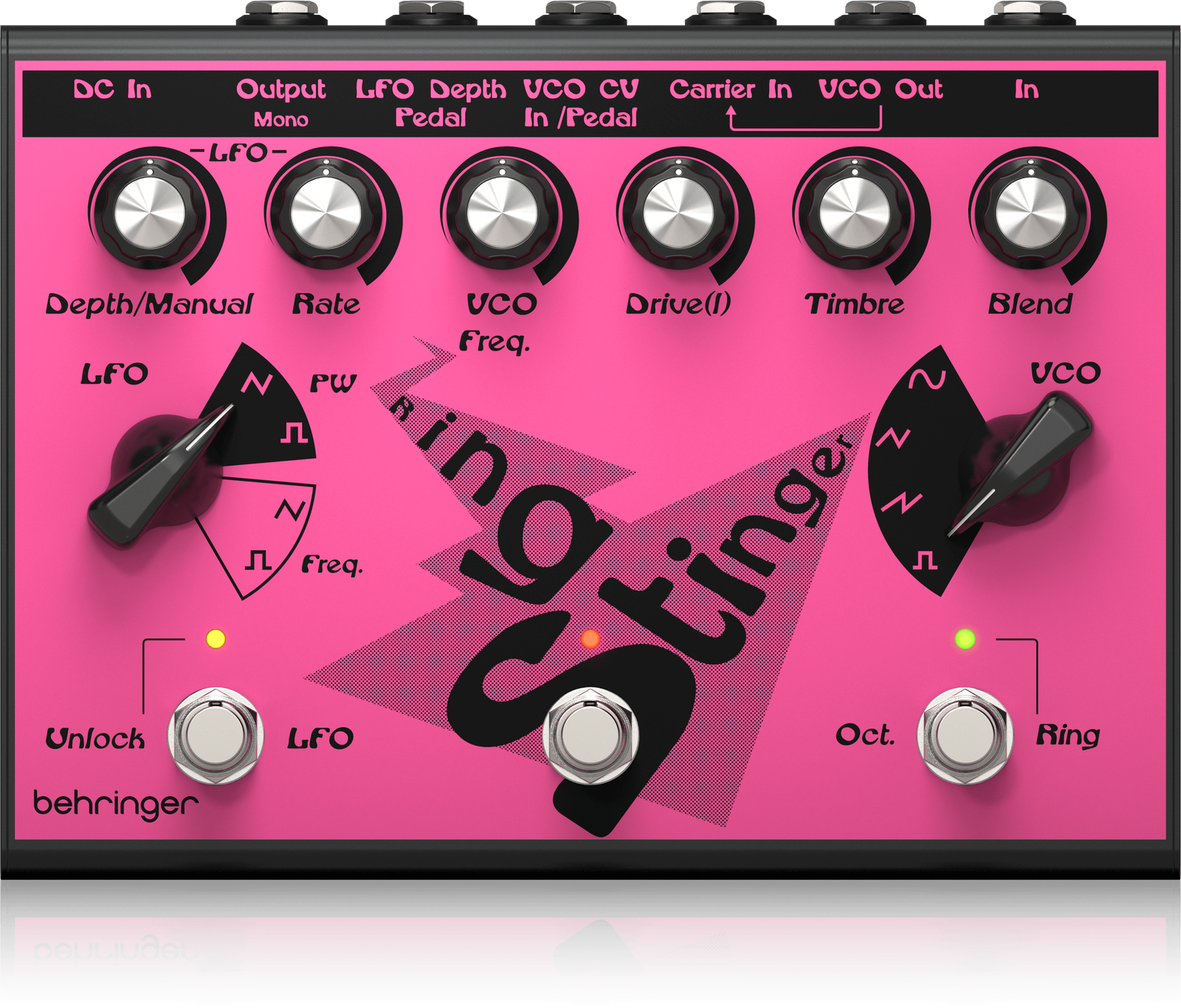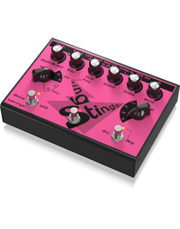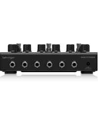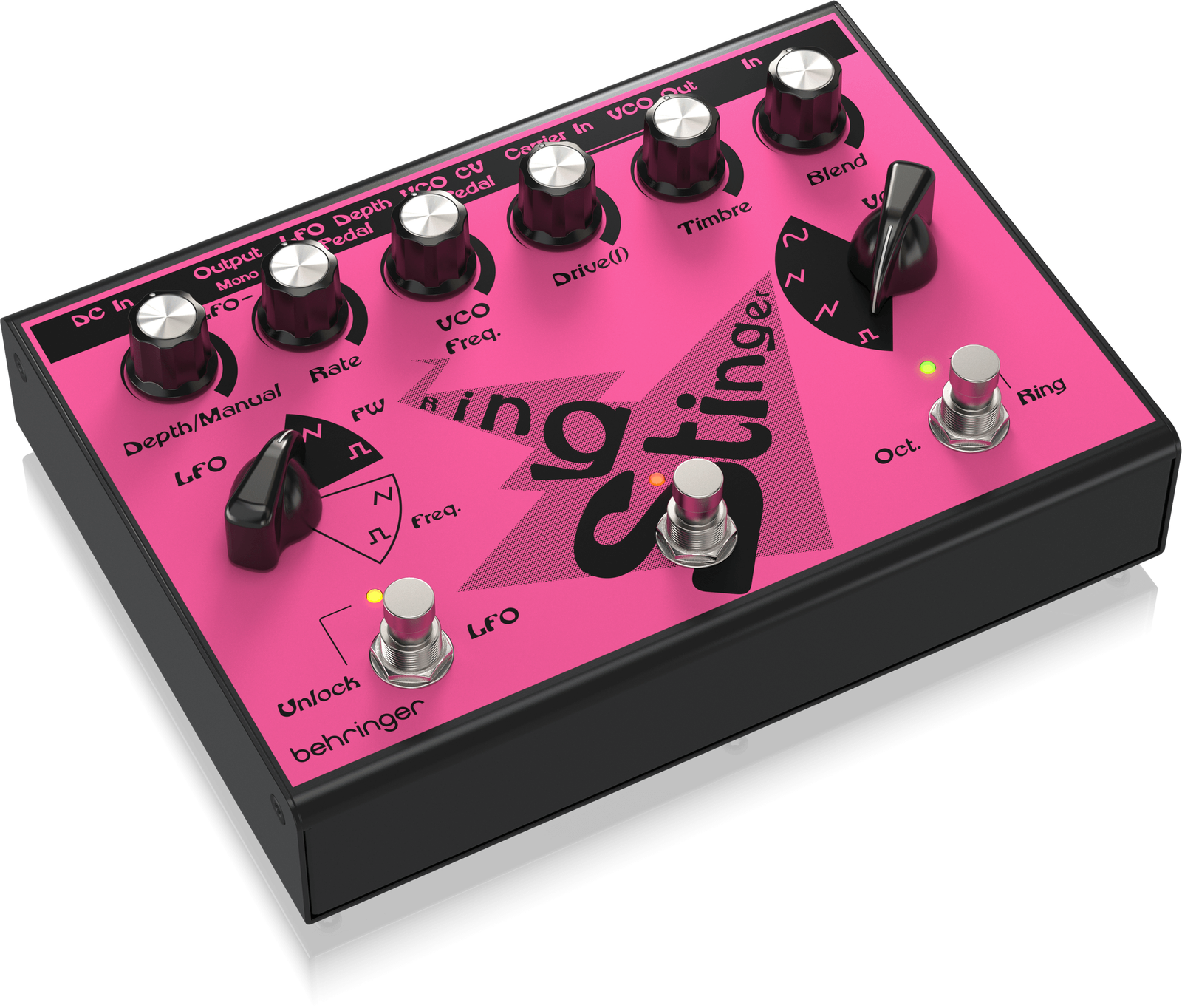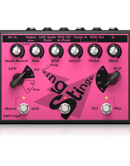 The Behringer Ring Stinger combines analogue ring modulation with fuzz circuitry and integrated VCO and LFO control, creating complex harmonic textures that move far beyond standard distortion. Ring modulation generates metallic overtones and sidebands by multiplying your input signal with an internal carrier. This process produces inharmonic, bell-like or dissonant tones that shift dramatically as frequency and depth are adjusted.
