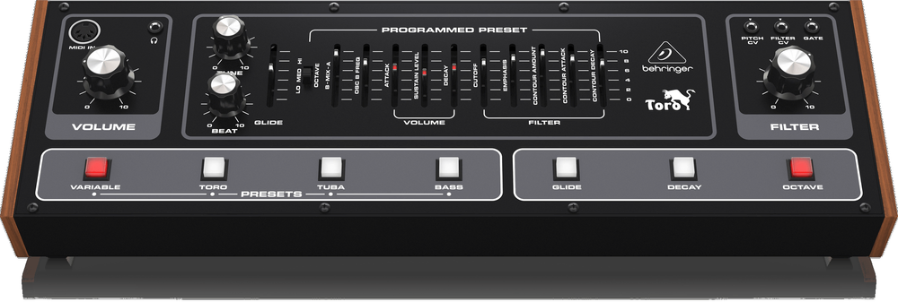 Being able to deliver massive detuned sounds thanks to its 2 VCOs allows the TORO to instantly produce that classic earth-shaking rumble of the original. The TORO isn’t just great for getting great bass sounds. Thanks to its 5-octave range, you can also get some nice searing lead sounds. The TORO comes with 4 sound pre-sets starting with the classic Toro, Tuba and Bass pre-sets which have been carefully recreated to sound just like the original as well as Variable, which gives you access to all controls so you can shape and fine tune your sound.