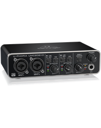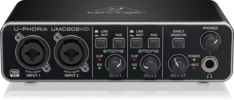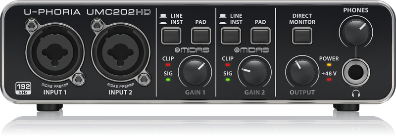 This blazingly fast USB 2.0 studio in a box will have you recording your next masterpiece in minutes with all the connectivity for microphones, guitars, bass and keyboards. Record the perfect vocal right to your computer-based DAW thanks to the 2 astonishingly pure, worldclass Midas-designed mic preamps, which include +48 Volt phantom power for condenser microphones, all going through studio-grade 24-Bit/192 kHz converters for the best possible sound quality. Whether you’re a singer-songwriter, producer on the go, or just need a rock-solid interface for running backing tracks at a gig, the ultra-dependable U-PHORIA UMC202HD will help you shine in the digital domain.
