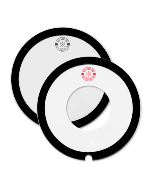 The Big Fat Snare Drum 14" Combo Pack - Original + Donut includes 1x 14" Original BFSD and 1x Steve's Donut BFSD. Add either the Original or the Donut to your snare for a medium beefy thud snare sound with the feel of a batter head. The centre circle cutout on the Donut gives you snare batter crack.