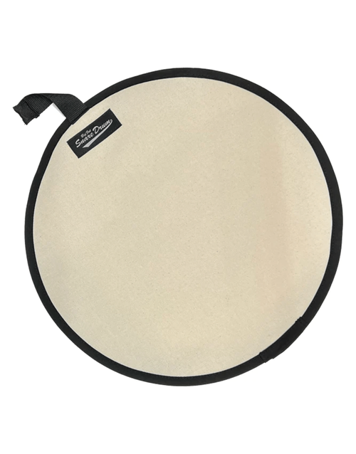 The Big Fat Snare Drum 14" - Quesadilla has a magnetic pull tab to stick to the rim, tension rod or lug of your snare or tom. There is also a sewn-in loop opposite the magnet pull tab through which the tab can be thread, creating a half-moon to lessen the dampening and add more stick attack as desired.