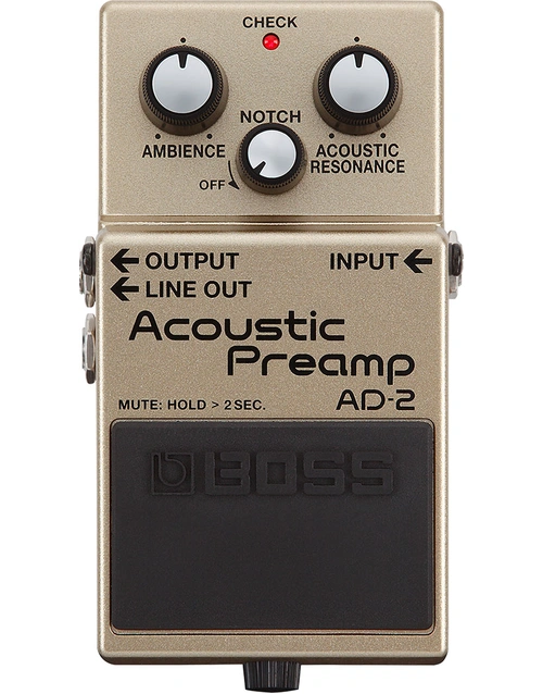 With the AD-2 Acoustic Preamp, acoustic-electric guitarists can now experience natural, studio-quality sound while performing on any stage. Equipped with an advanced BOSS sound engine, this compact pedal packs sophisticated processing power that belies its small size and simple, intuitive interface. Acoustic Resonance reproduces the complex resonance characteristics of your unplugged tone, while Ambience provides pro-level reverberation perfectly optimized for acoustic guitar. The AD-2 also features essential stage tools such as a notch filter for feedback control, a balanced DI out for direct connection to a PA, and a convenient mute function for tuning and switching guitars.