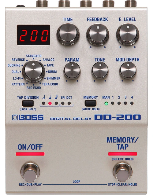 The Boss DD-200 Digital Delay is part of the new 200 series pedals from Boss. These pedals will save space on your pedal board, but pack versatility and premium audio quality thanks to their 32-bit AD/DA, 32-bit internal processing, and 96 kHz sampling rate. They also support additional control via external switches, an expression pedal, or MIDI. The DD-200 inherits many features from the flagship DD-500 Delay Pedal, but at a price and size that works for you. The easy to use interface means you'll be playing more and dialling in less. Four onboard memories let you recall your favourite settings when you need them.