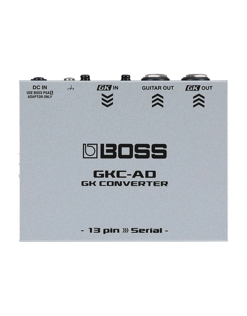 Next-Gen BOSS guitar synthesizer products use the Serial GK digital interface, which is a new connection method that offers improved performance over the analogue 13-pin GK interface used in previous products. The GKC-AD GK Converter allows you to use a Roland GK-3 or GK-3B Divided Pickup or an instrument with a 13-pin GK output to drive the Serial GK input on the GM-800 Guitar Synthesizer.