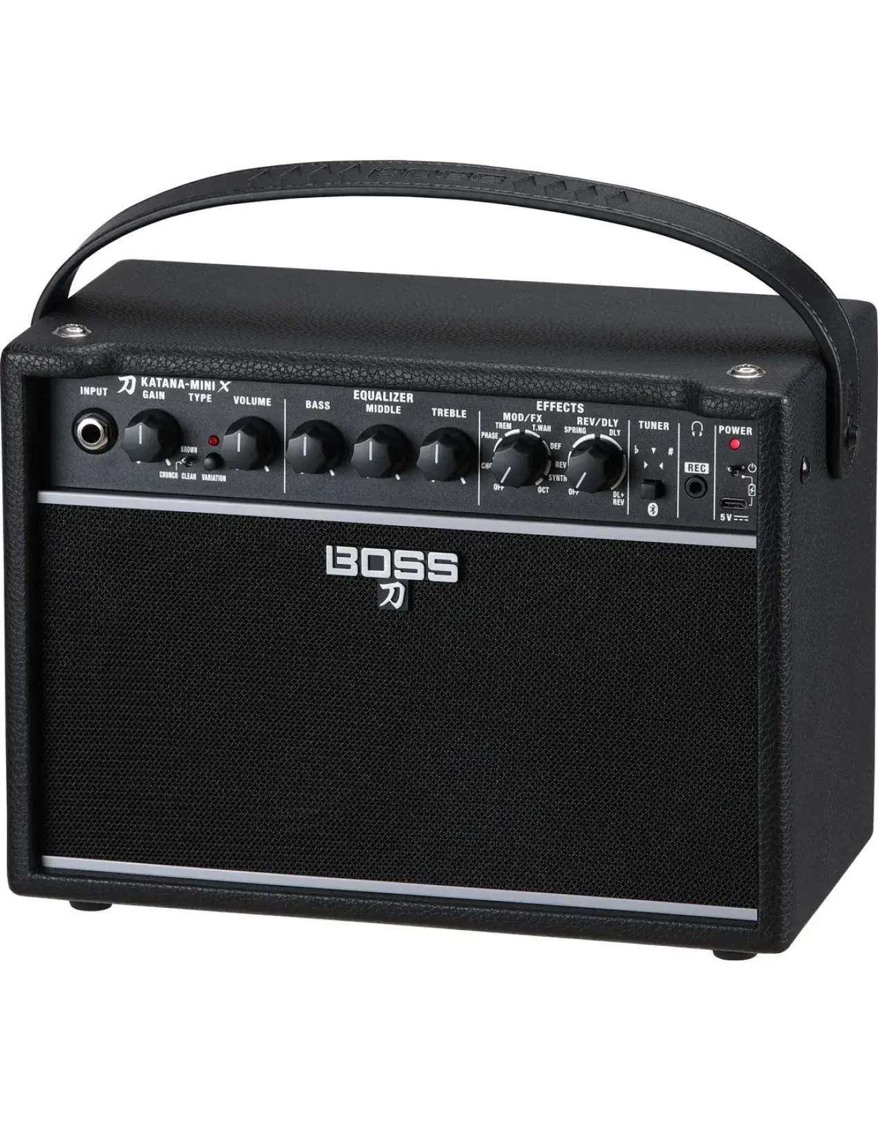 The BOSS Katana-Mini X is a compact, 10-watt amplifier that delivers rich, dynamic Katana tones. Featuring three core amp types with variations—Clean, Crunch, and Brown—it suits a wide range of instruments, including electric, acoustic-electric, and bass. The sturdy wood cabinet with a custom 5-inch speaker ensures powerful sound, while onboard Bluetooth enables wireless audio streaming for practice or jamming. With two simultaneous effects sections, a built-in tuner, 10-hour rechargeable battery, and headphone output with cabinet simulation, it’s a versatile amp for home, or travel. Lightweight yet robust, the Katana-Mini X is ready to go wherever your music takes you.