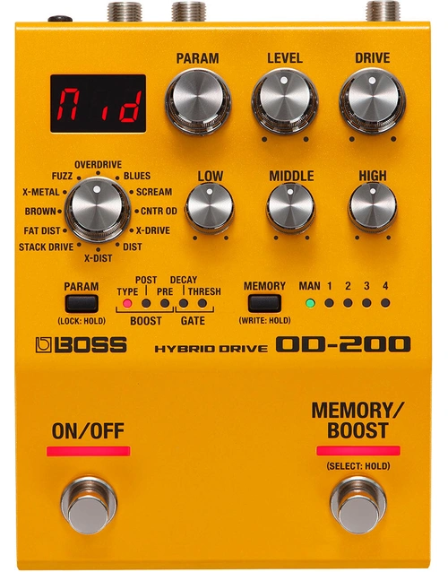 The Boss OD-200 Hybrid Drive Pedal is part of the new 200 series pedals from Boss. These pedals will save space on your pedal board, but pack versatility and premium audio quality thanks to their 32-bit AD/DA, 32-bit internal processing, and 96 kHz sampling rate. They also support additional control via external switches, an expression pedal, or MIDI.