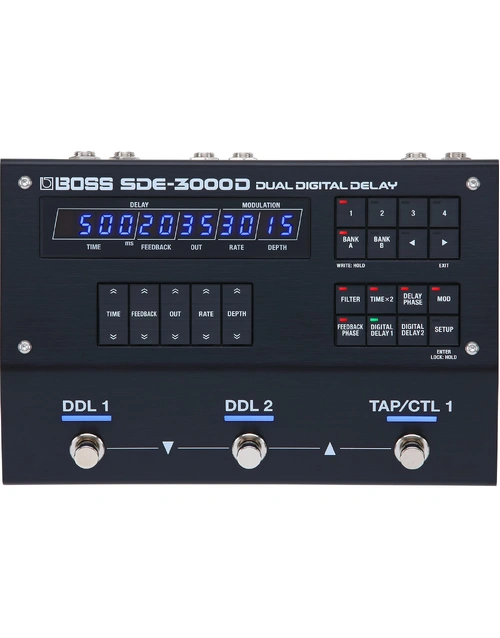 | Controls | TIME button, FEEDBACK button, OUT button, RATE button, DEPTH button, 1--4 buttons, BANK A button, BANK B button, LEFT button, RIGHT button, FILTER button, TIME×2 button, DELAY PHASE button, MOD button, FEEDBACK PHASE button, DIGITAL DELAY1 button, DIGITAL DELAY2 button, SETUP button, DDL1 switch, DDL2 switch, TAP/CTL1 switch |