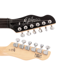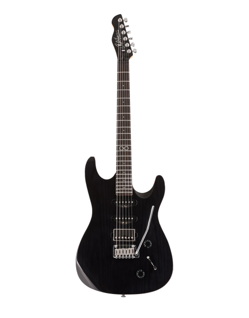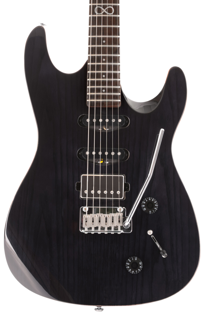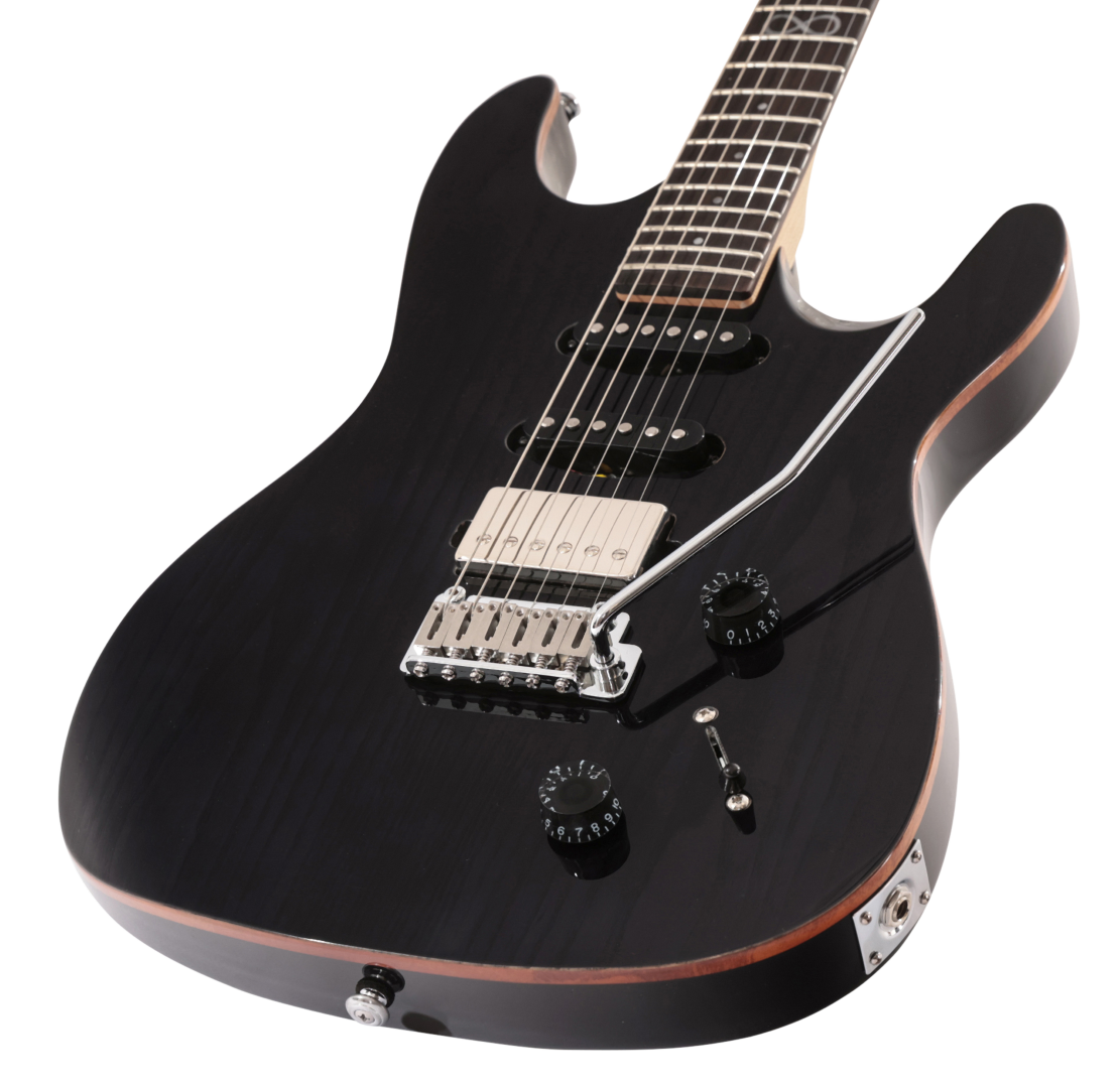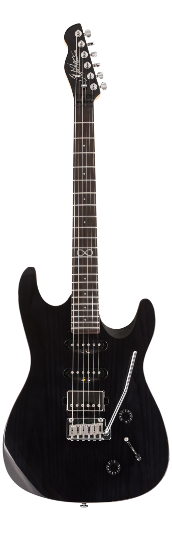 A modern recessed bolt-on neck construction with ergonomic cutaways, combined with a slick satin-finished Maple neck and Macassar Ebony fingerboard are perfectly designed for hours of comfortable and tasty shredding. An Ash top with a Gloss Black finish makes for one head-turning guitar, as well as adding just enough brightness to the warmth of the Mahogany body.