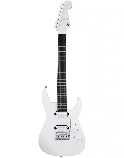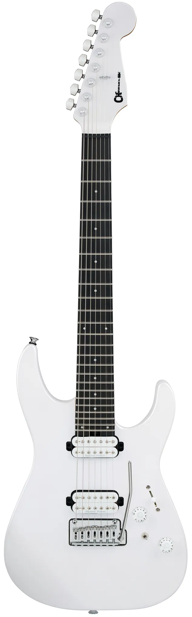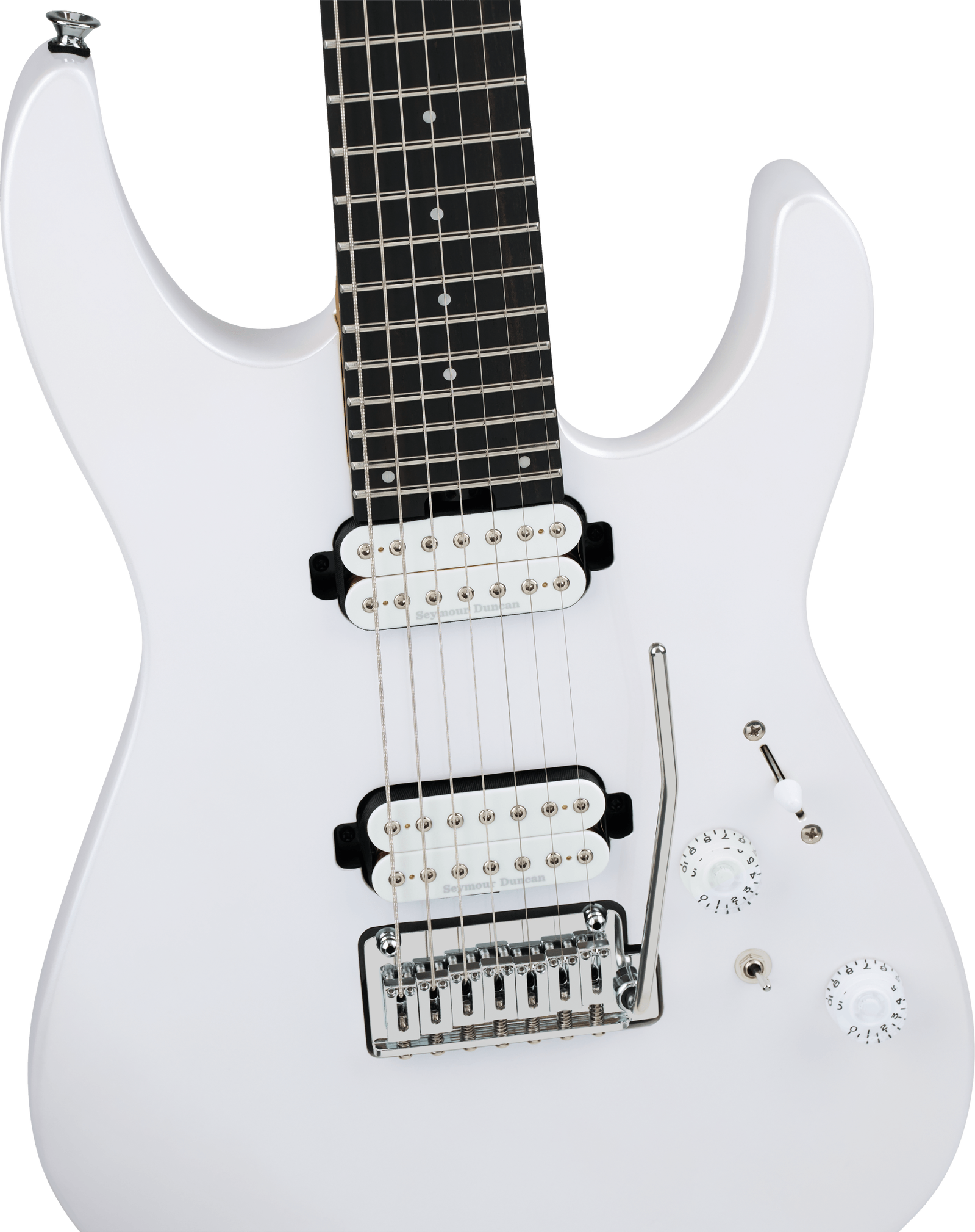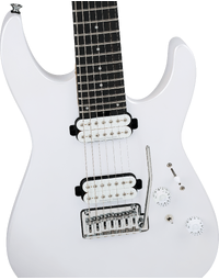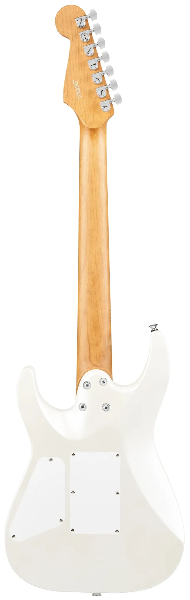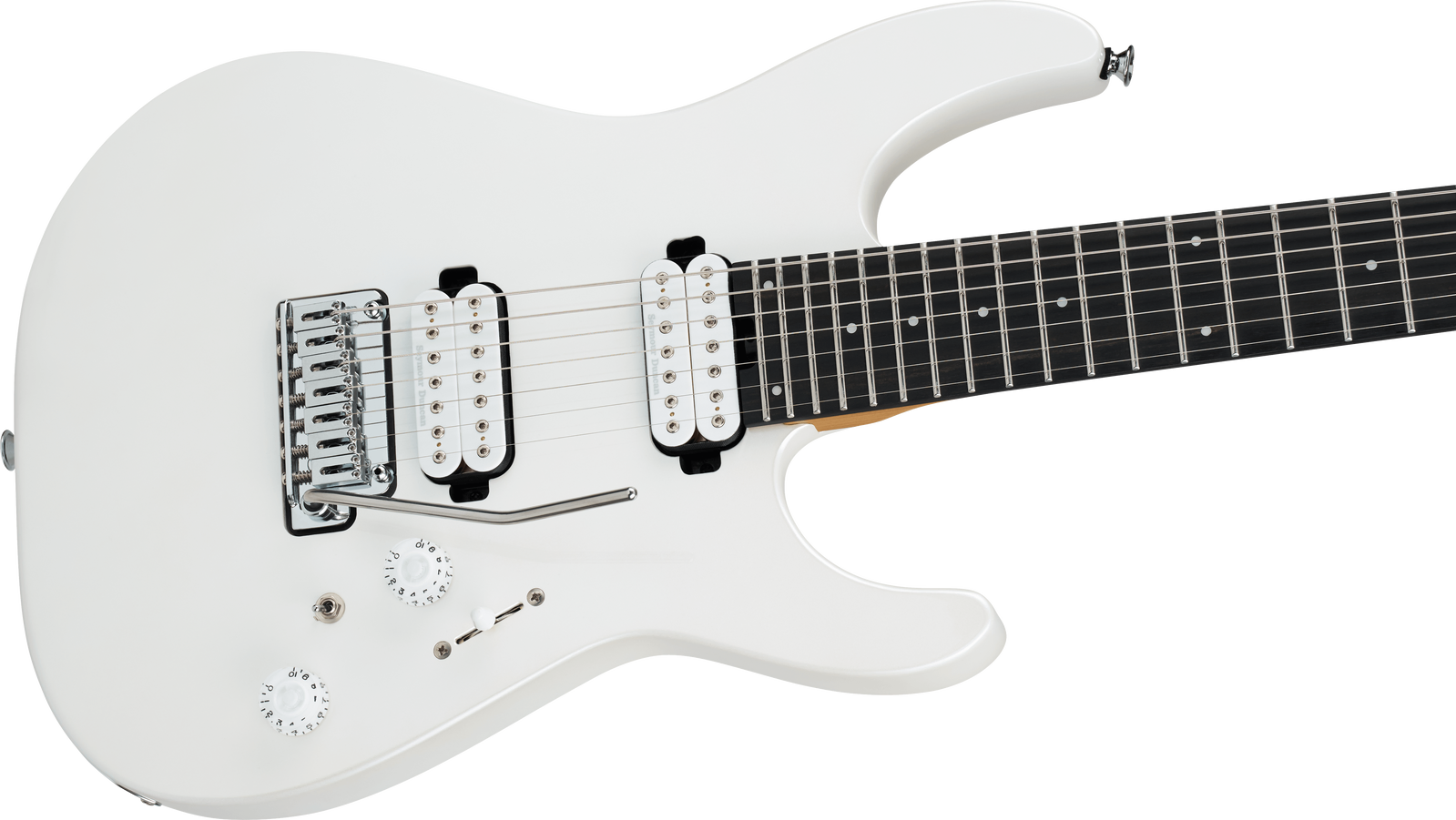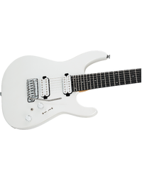 The Charvel Pro-Mod Plus DK24-7 HH 2PT EB Celestial Silk is built for players who need extended low-range authority without sacrificing speed or articulation. The alder Dinky body provides a balanced tonal response with clear mids and firm low-end support, which helps maintain definition on a seven-string platform. A bolt-on caramelised maple speed neck reinforced with graphite increases stability and resists movement under string tension, while the hand-rubbed urethane back finish reduces friction during rapid shifts.
