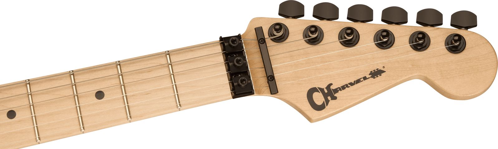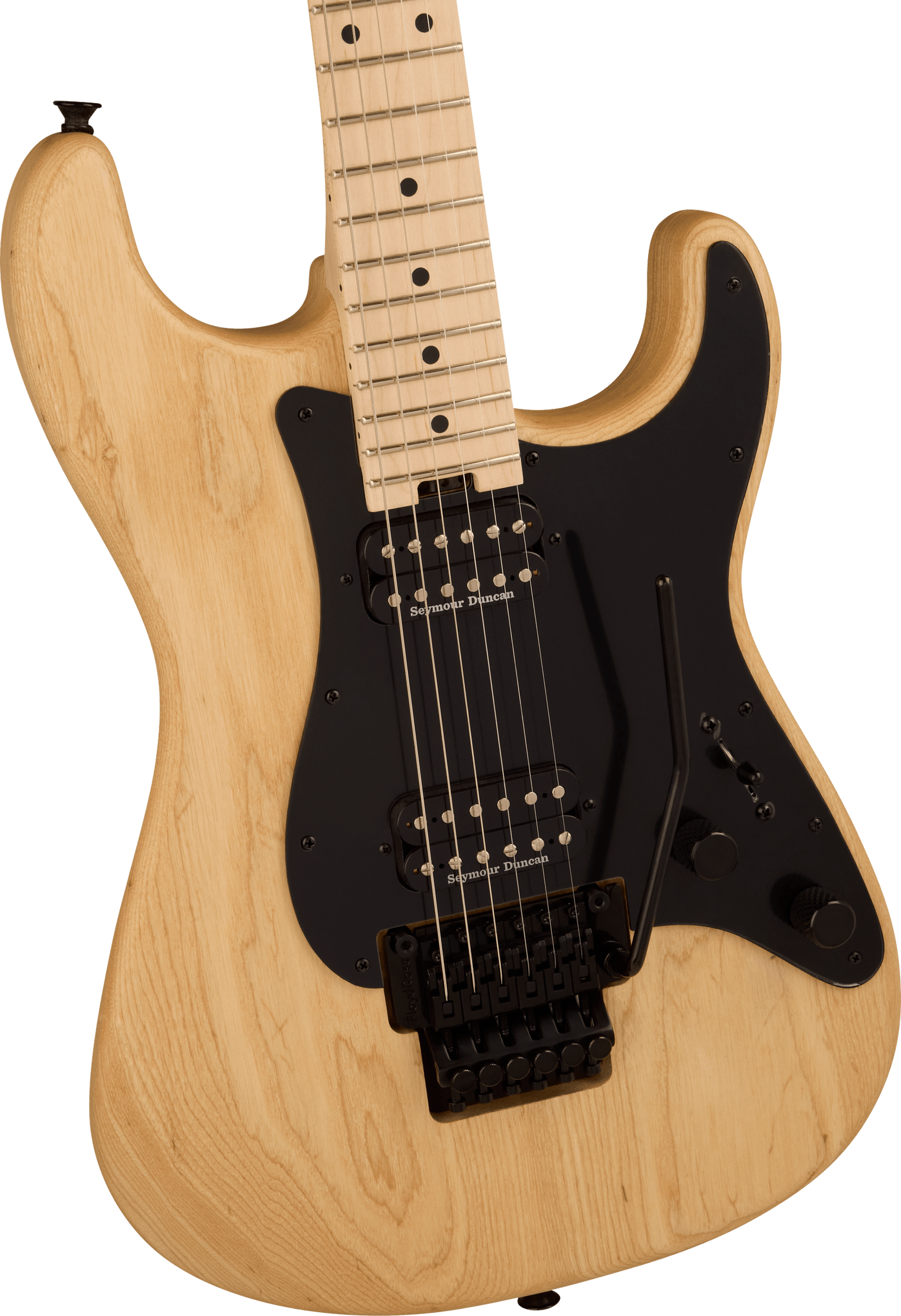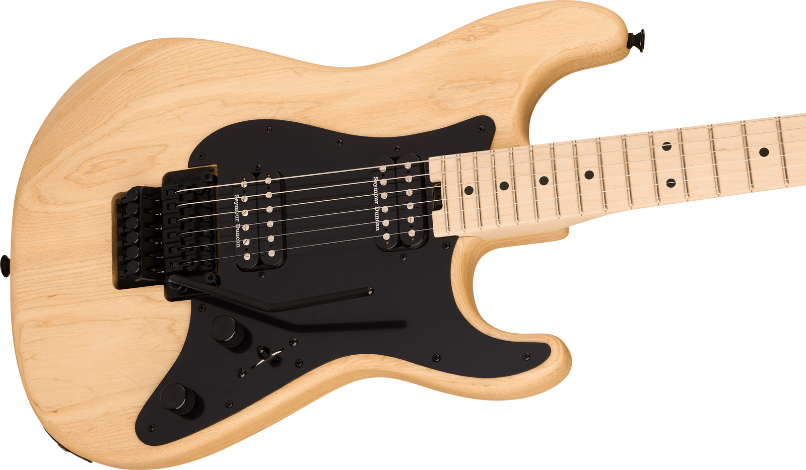 The Charvel Pro-Mod So-Cal Style 1 HH FR M MN in Natural Ash delivers modern performance with a bold aesthetic. Its alder body is paired with a satin maple speed neck and a 12"-16" compound radius maple fretboard for fast, fluid playing across all 22 jumbo frets. Outfitted with Seymour Duncan Distortion SH-6N and TB-6 pickups, this So-Cal offers thick, aggressive tones, with coil-splitting on the volume knob and a no-load tone control for tonal versatility. A recessed Floyd Rose 1000 Series tremolo locks down tuning stability, even under heavy dive bombs and flutters.