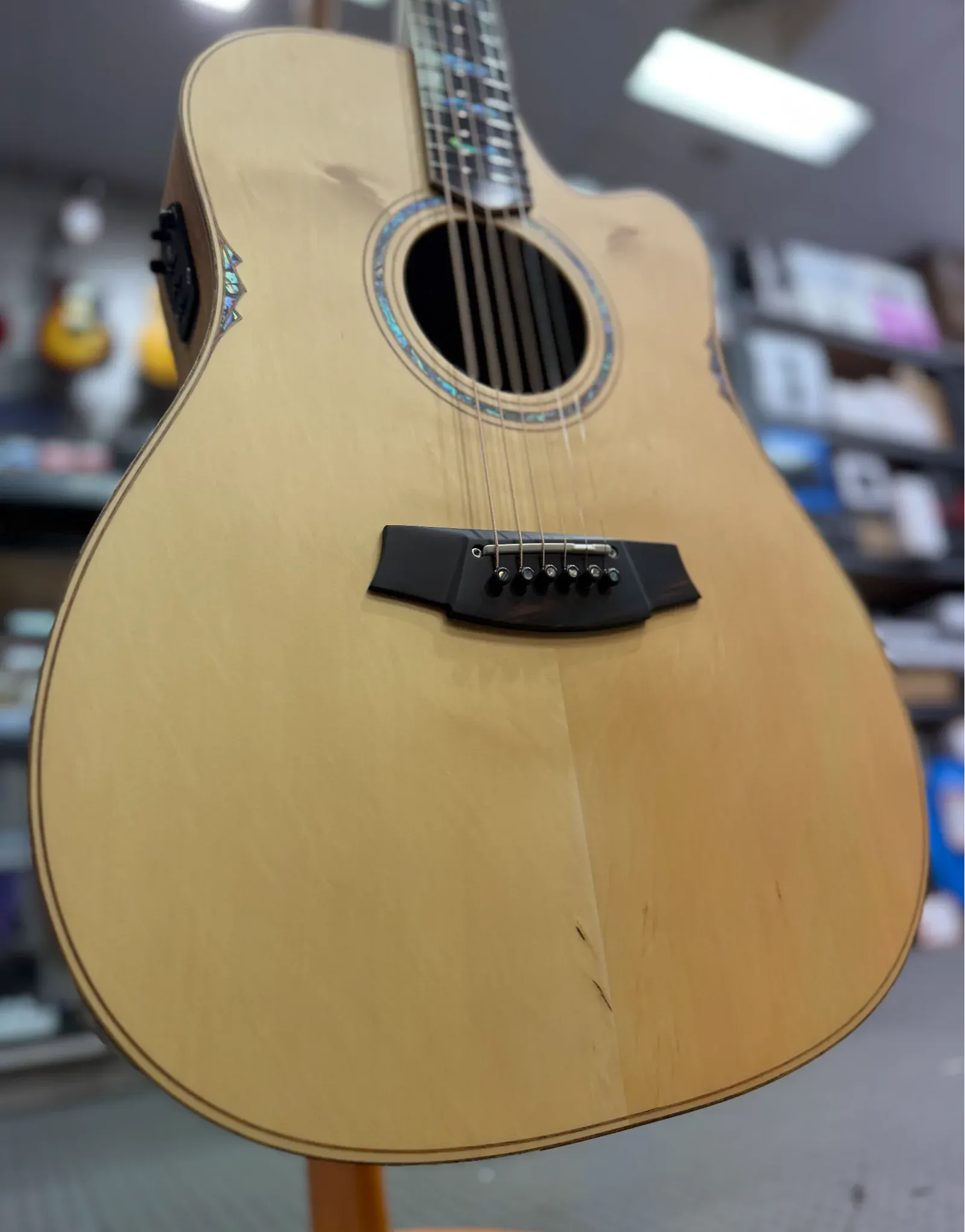 Spanish Heel construction integrates the neck into the body for improved sustain and long-term stability. A Queensland Maple neck with a 25.5″ scale, 44mm nut width and 12″ radius ebony fingerboard supports confident fretting and dynamic rhythm work. Ebony’s density slightly reduces bottom-end bloom, tightening the response of a large dreadnought body.