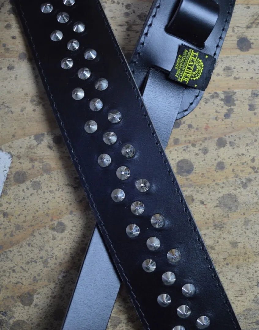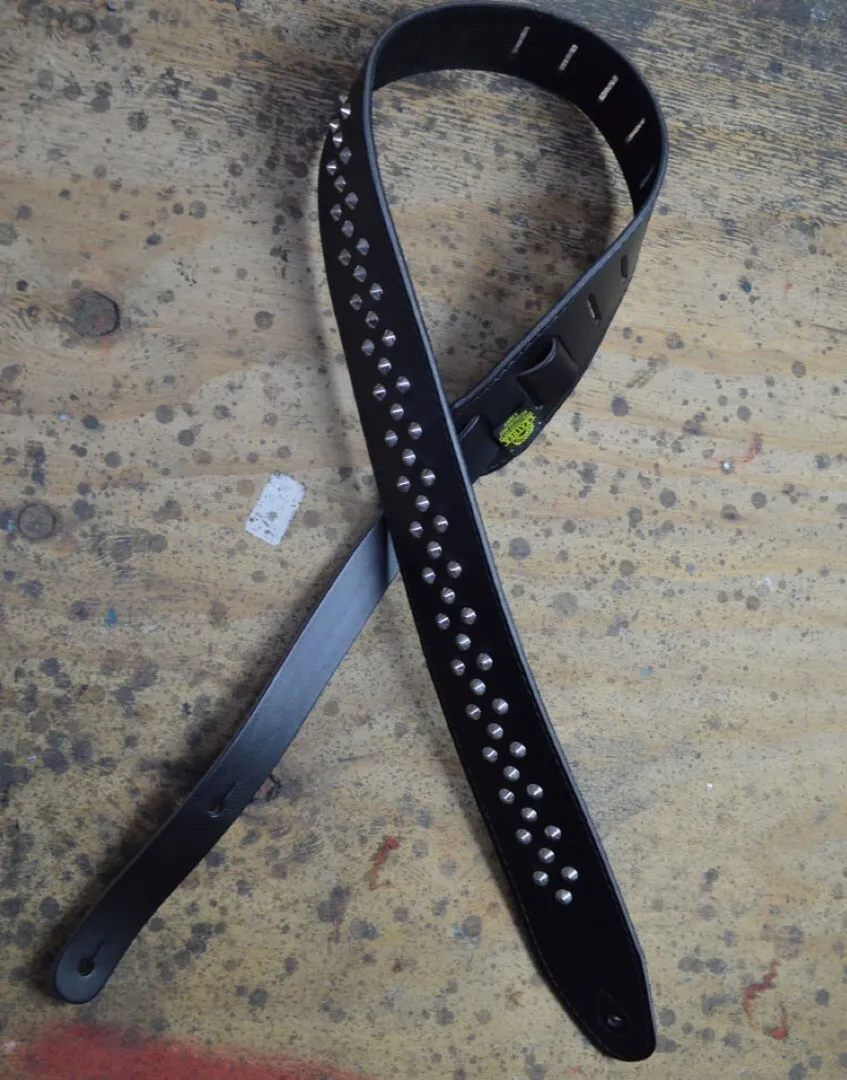 2.5″ suede backed and stitched leather guitar strap with metal studs. Billet adjustable in length from 80cm to 135cm. Made in Australia.