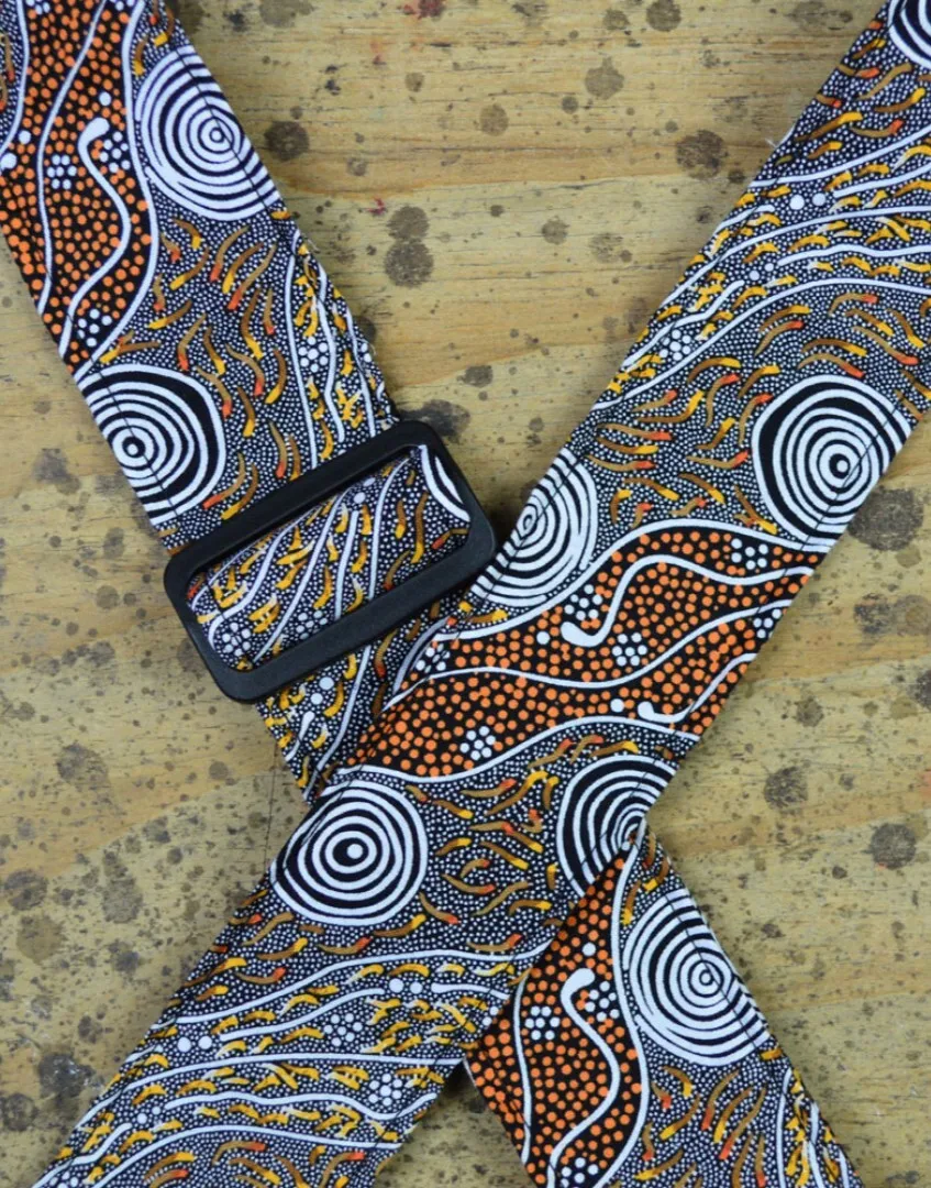 Bush Camp Aboriginal Art fabric sewn on 50mm webbing with 3mm genuine leather ends. Slide adjustable in length from 80cm to 130cm. Made In Australia.