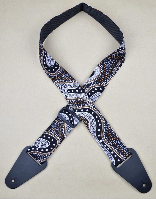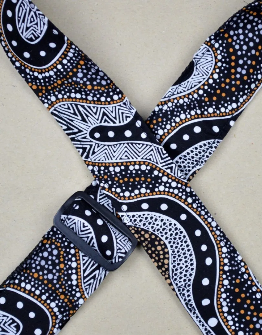 Possum Dreaming Aboriginal Art fabric sewn on 50mm webbing with 3mm genuine leather ends. Slide adjustable in length from 80cm to 130cm. Made In Australia.
