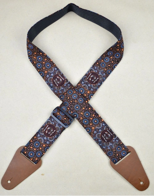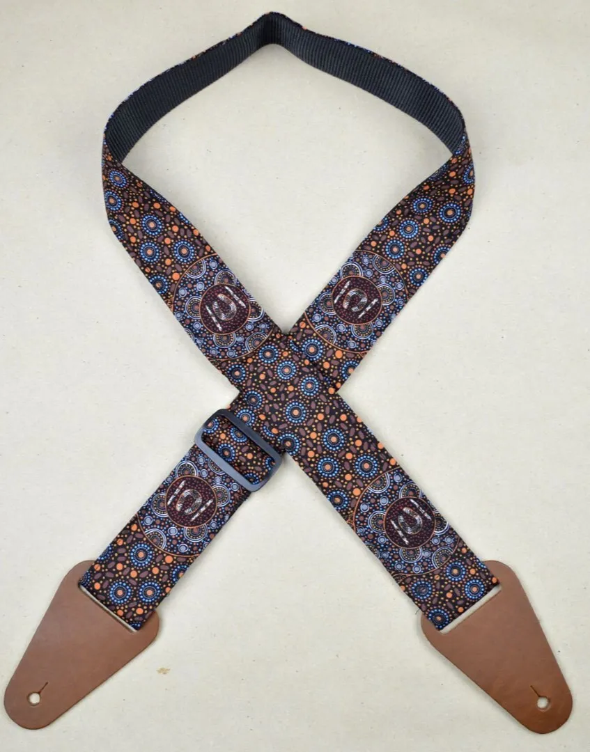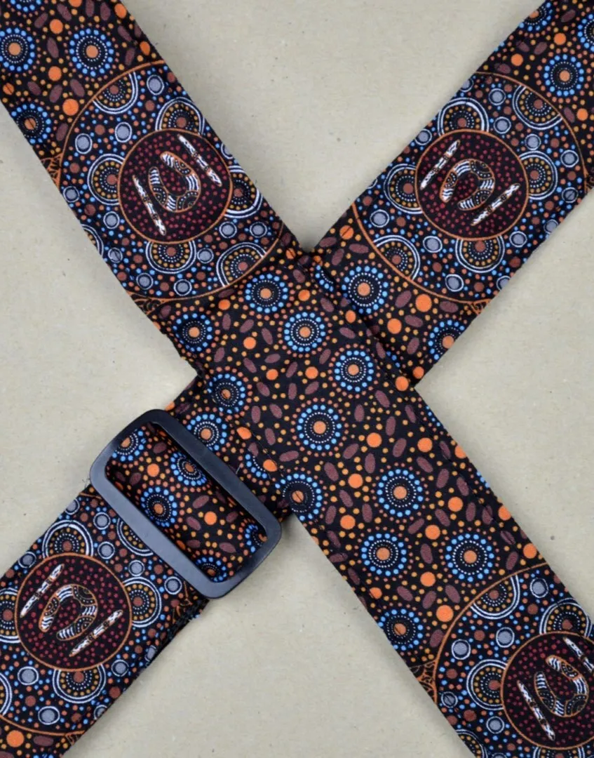 Water Collecting Aboriginal Art fabric sewn on 50mm webbing with 3mm genuine leather ends. Slide adjustable in length from 80cm to 130cm. Made In Australia.