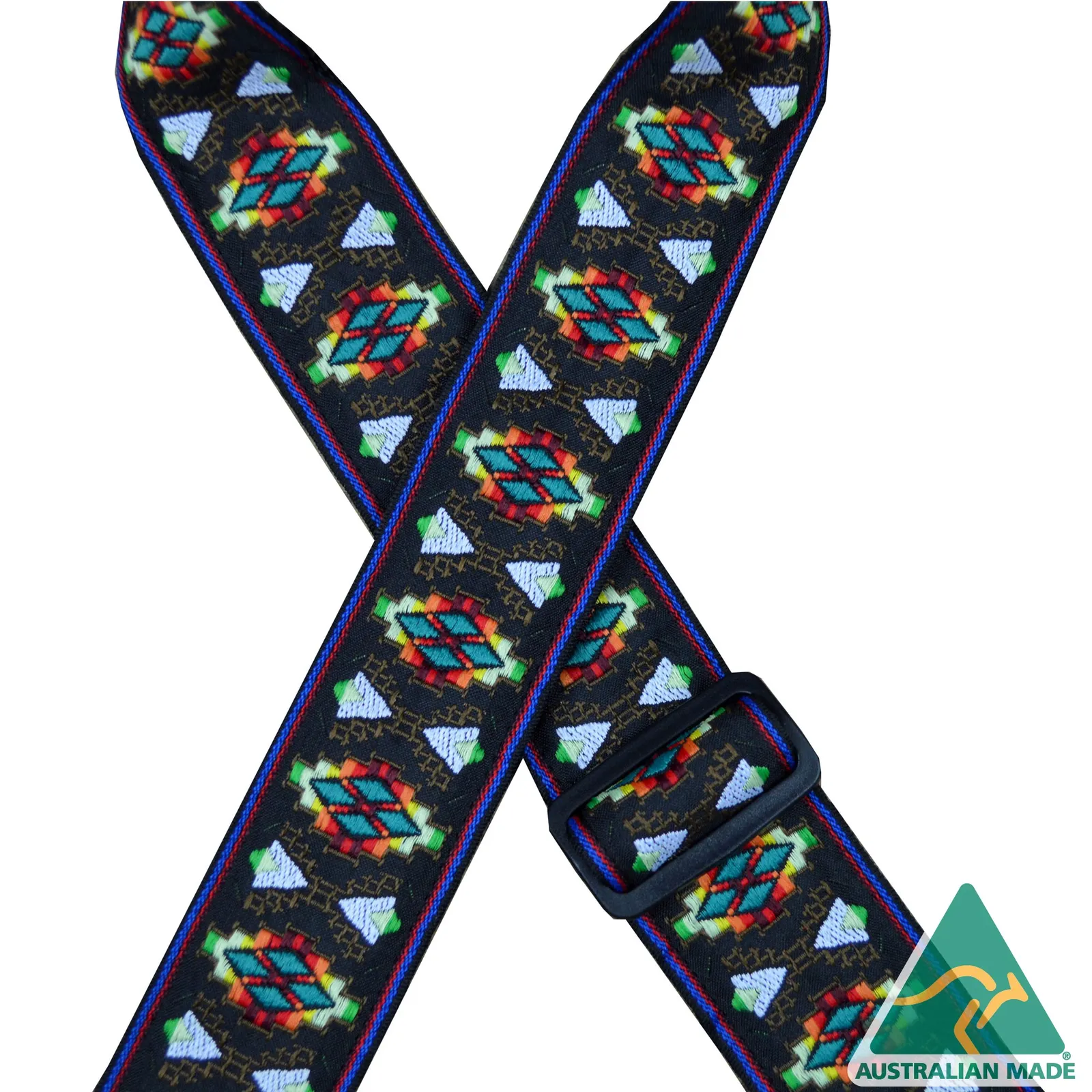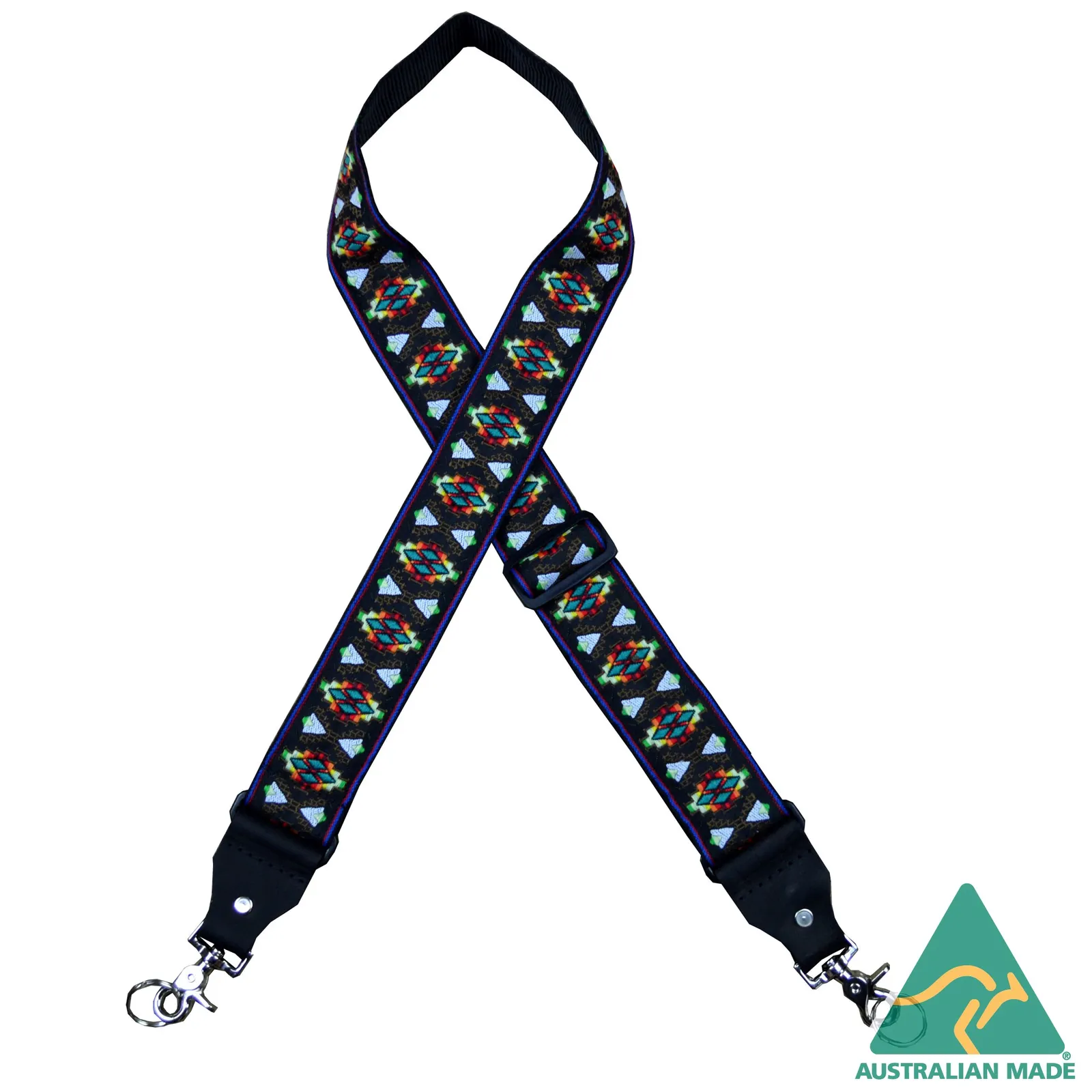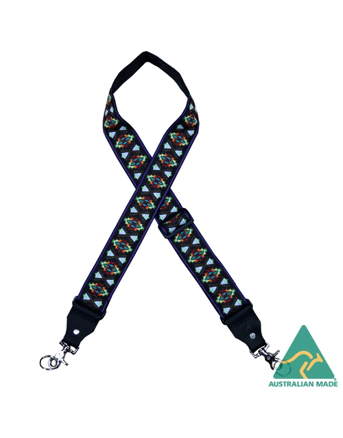 Jacquard fabric sewn onto 50mm webbing with leather ends securing the nickel metal hooks and split rings. Slide adjustable in length from 90cm to 150cm. Made in Australia.