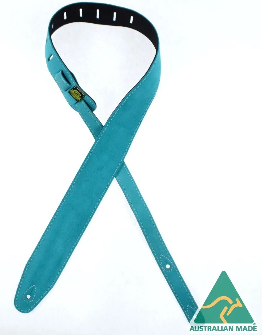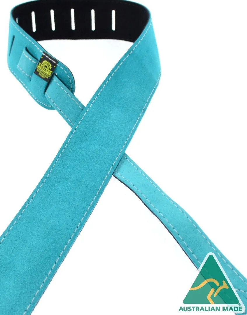 2.5″ suede backed and stitched suede guitar strap. Billet adjustable in length from 80cm to 135cm. Made in Australia.
