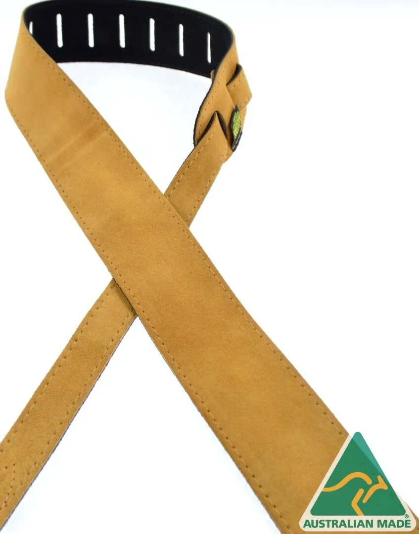 2.5″ suede backed and stitched suede guitar strap. Billet adjustable in length from 80cm to 135cm. Made in Australia.