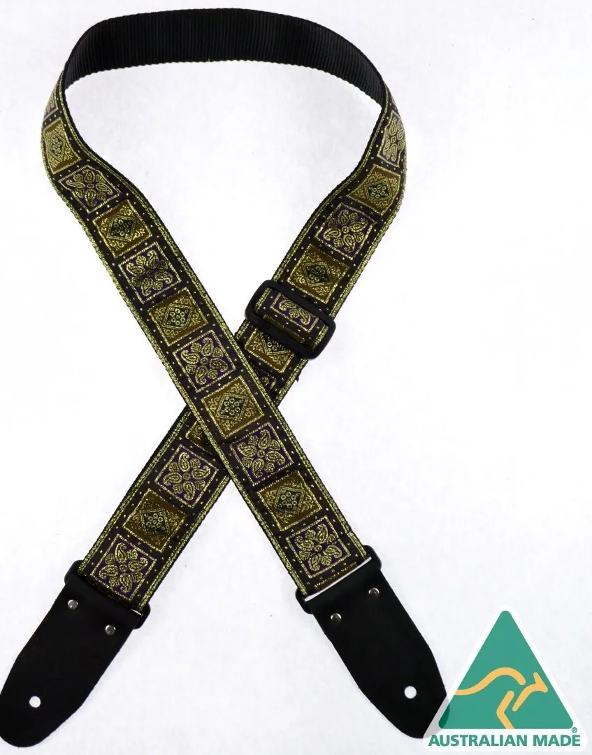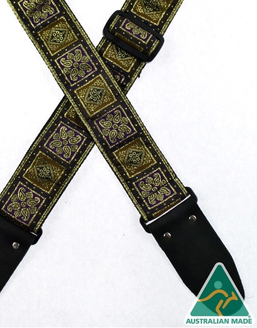 Jacquard design sewn onto 50mm webbing. 2mm Genuine leather ends. Slide adjustable in length from 80cm to 130cm. Made in Australia.