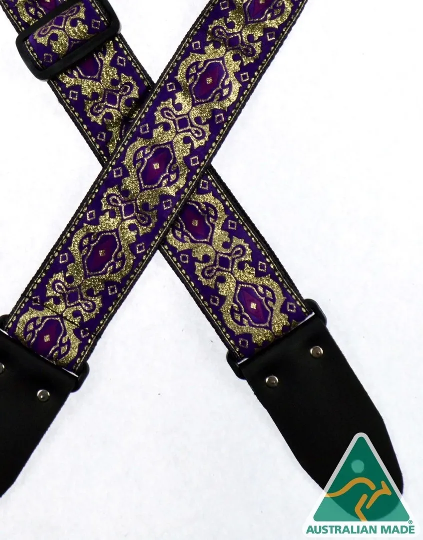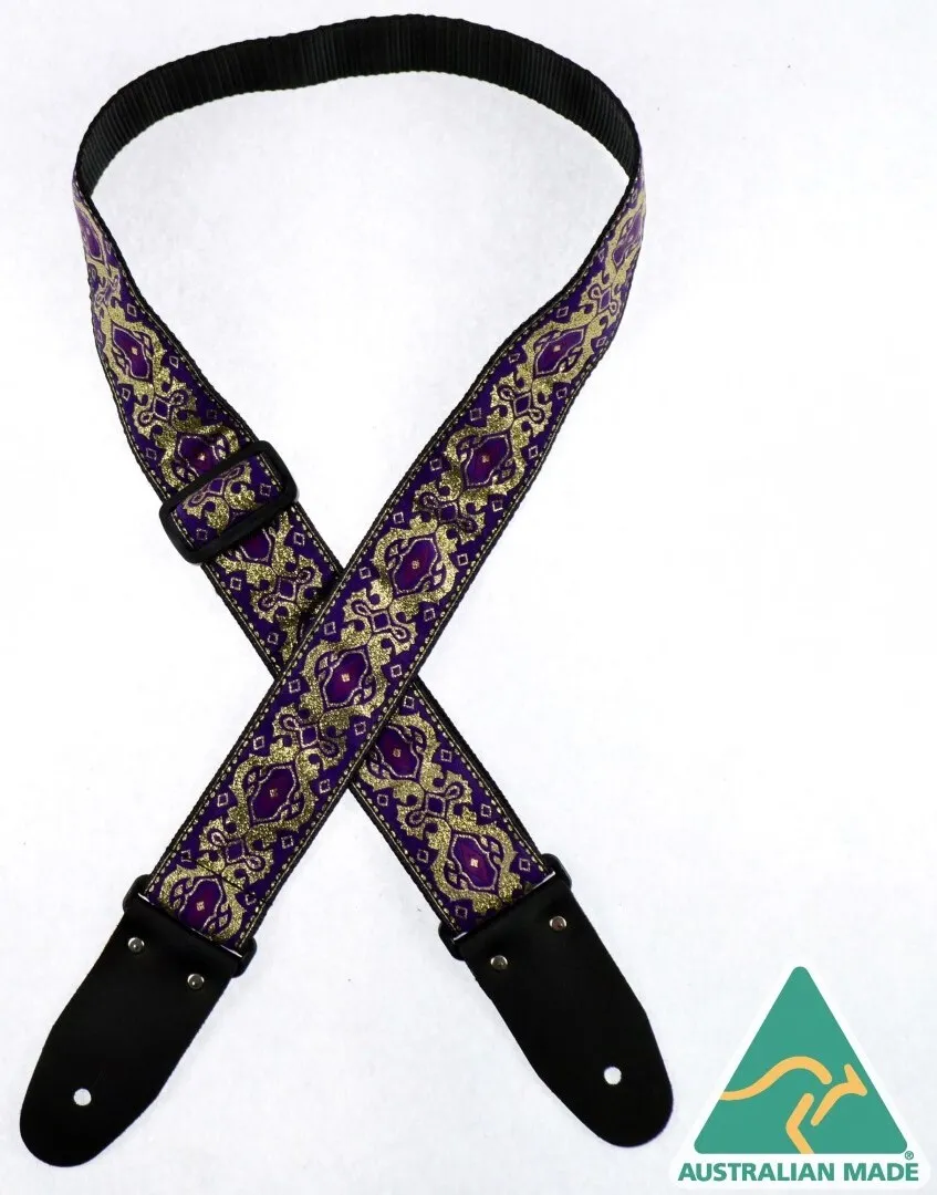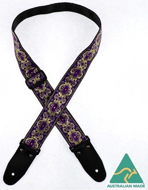 Jacquard design sewn onto 50mm webbing. 2mm Genuine leather ends. Slide adjustable in length from 80cm to 130cm. Made in Australia.