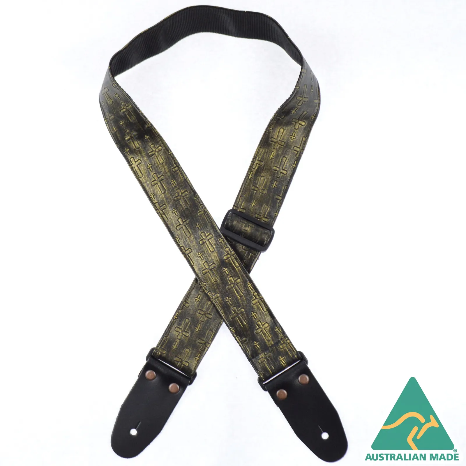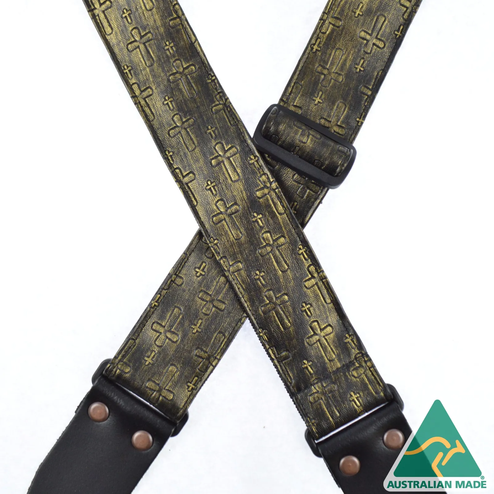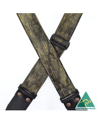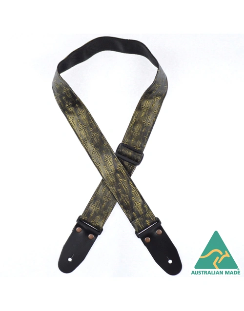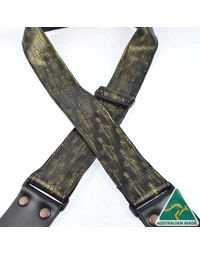 Embossed material sewn onto 50mm webbing. 2mm Genuine leather ends with large antique copper finish rivets. Slide adjustable in length from 80cm to 130cm. Made in Australia.