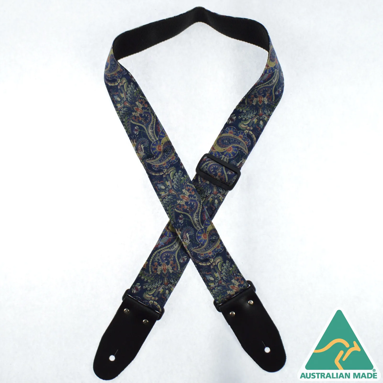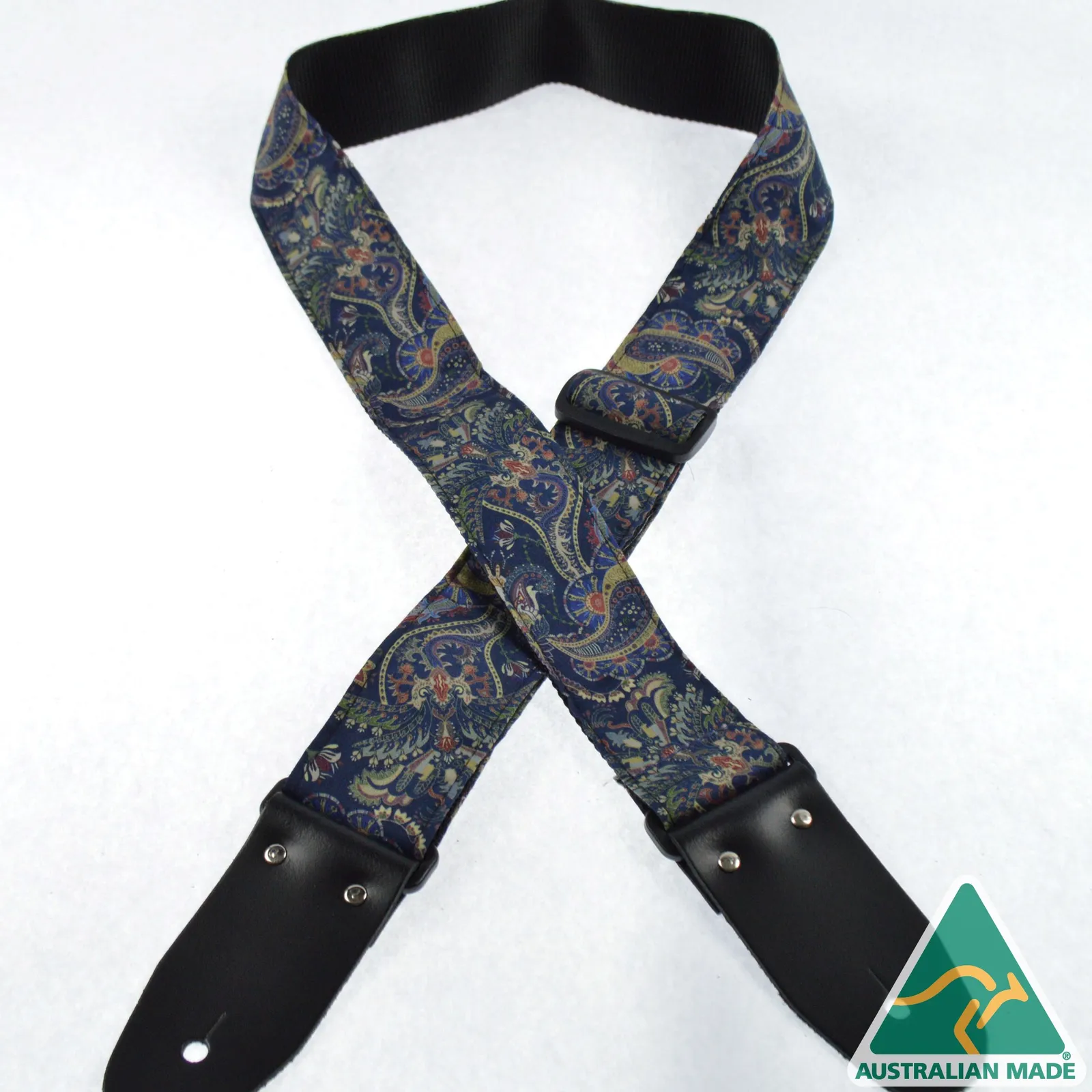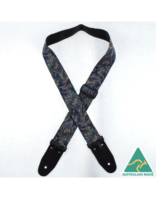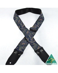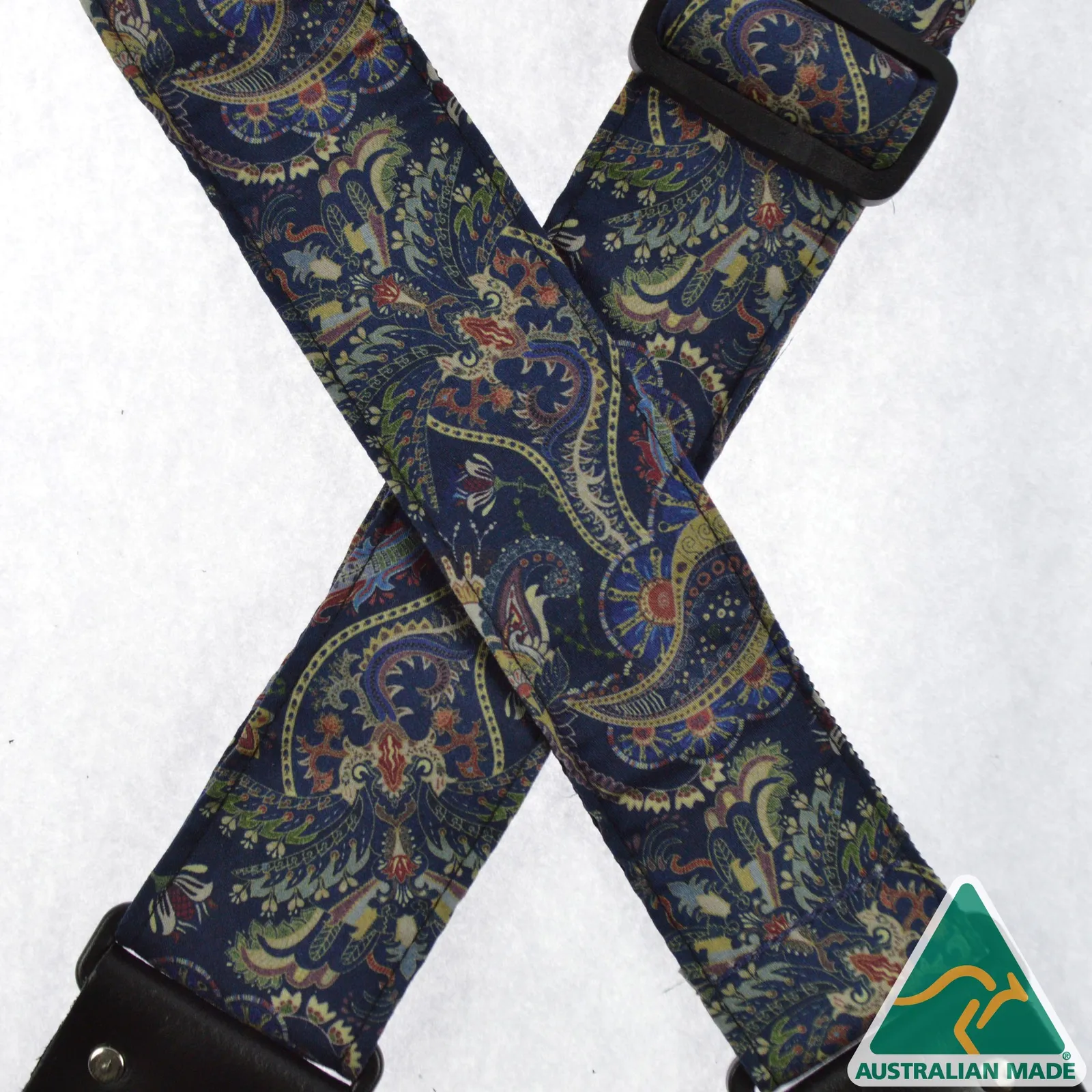 Fabric sewn onto 50mm webbing. Heavy duty 3mm genuine leather ends. Slide adjustable in length from 80cm to 130cm. Made in Australia.