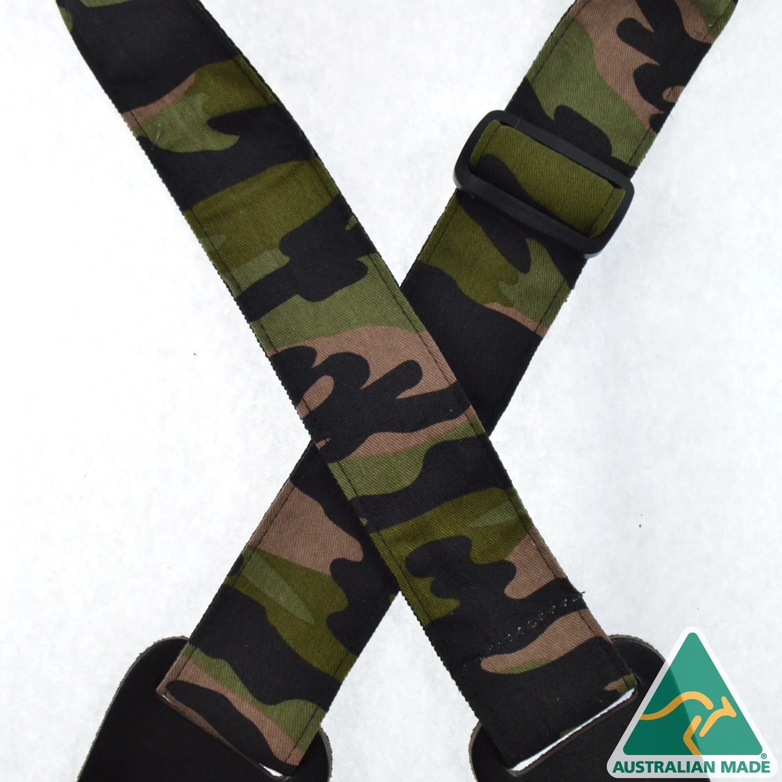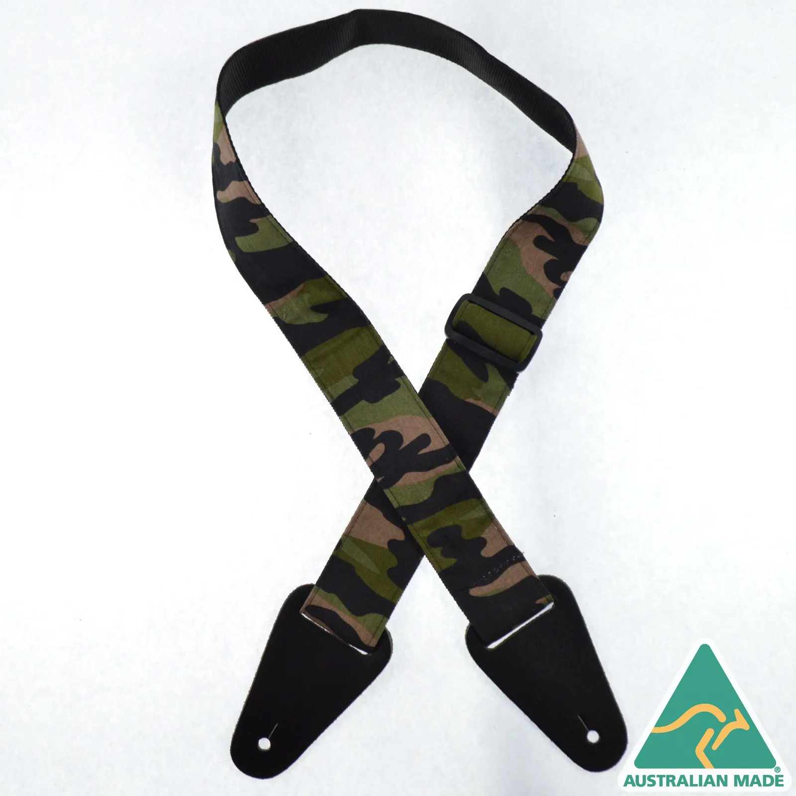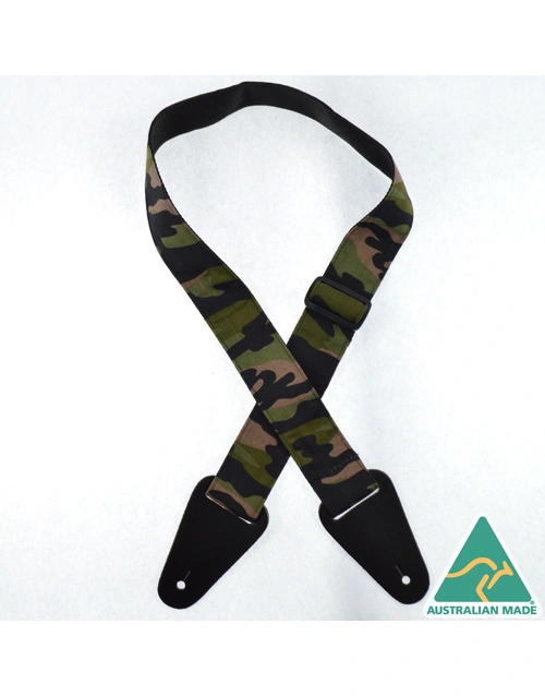 Printed material sewn onto black 50mm webbing guitar strap. 3mm genuine leather ends. Slide adjustable in length from 80cm to 135cm. Made in Australia.