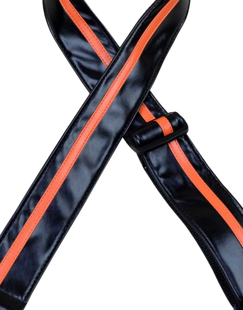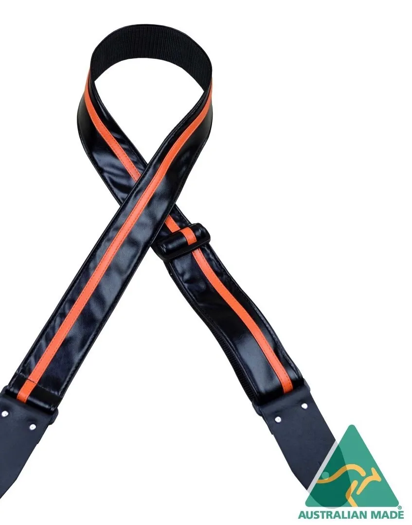 Strap featuring a laminate material with a contrasting stripe sewn onto the top. Folded and stitched onto 50mm webbing with 2mm genuine leather ends. Slide adjustable in length from 80cm to 130cm. Made in Australia.