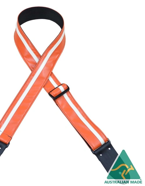 Strap featuring a laminate material with a contrasting stripe sewn onto the top. Folded and stitched onto 50mm webbing with 2mm genuine leather ends. Slide adjustable in length from 80cm to 130cm. Made in Australia.
